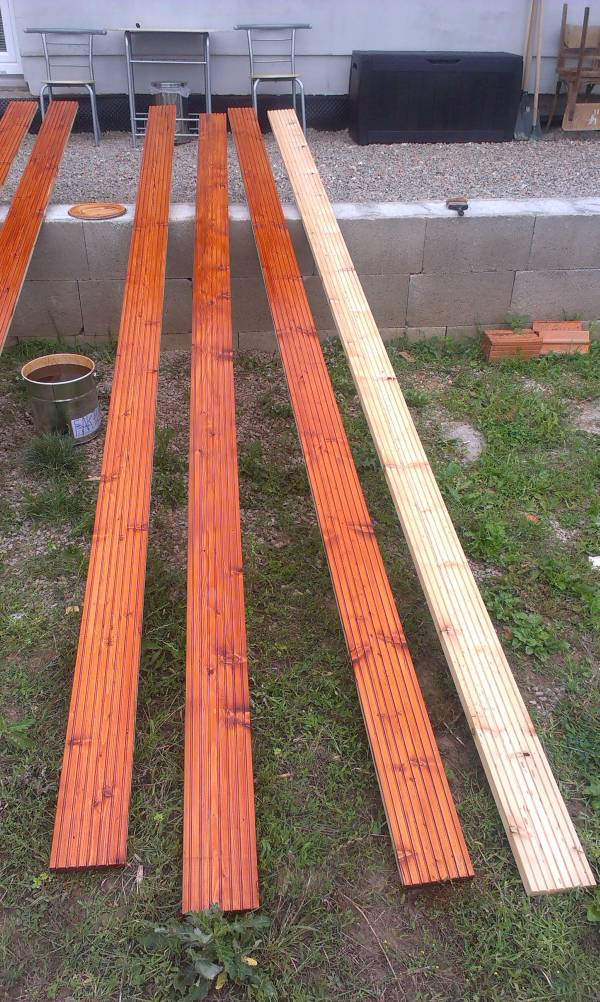 Pri diskusii na poradni som narazil na jeden odkaz, kde bol ako materiál použitý Sibírsky smrekovec. Toto drevo sa vyznačuje vysokým podielom živíc a tým pádom aj odolnosťou voči vlhku a hnilobe. Uvádza sa, že jeho životnosť bez špeciálneho ošetrenia je až 20 rokov. To som samozrejme nechcel riskovať a navyše neošetrené drevo pomerne rýchlo zošedne, čo sa mne osobne nepáči. Na ošetrenie dreva a zmenu jeho farby som použil terasový olej Impranol Teoma. Drahý jak šlak, ale myslím, že sa oplatil.