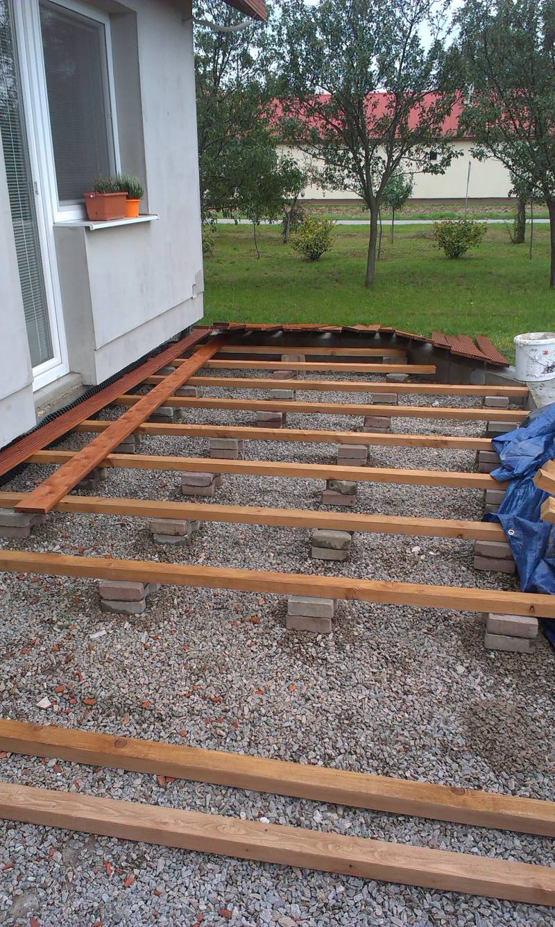 Vychádzal som z predpokladu, že po terase budú chodiť ľudia a bude tam nábytok, či zariadenie rádovo v desiatkách kilov. Spolu s ľuďmi sa jedná o pomerne malú záťaž, ktorá sa navyše rozloží na veľkú plochu nakoľko každá doska má 4m, čo je priemer 8 roštov na dosku. Napriek tomu som spravil aspoň náznak udupania a to tým, že som vysypal kôpku štrku, na ktorú som položil kus zámkovej dlažby. Po ňom som niekoľkokrát silno udrel gumeným kladivom pričom som ho držal v rovine pomocou vodováhy, čím som vytvoril spevnené štrkové lôžko. Najprv som si budoval rošty na "nečisto" ako vidieť na obrázku.