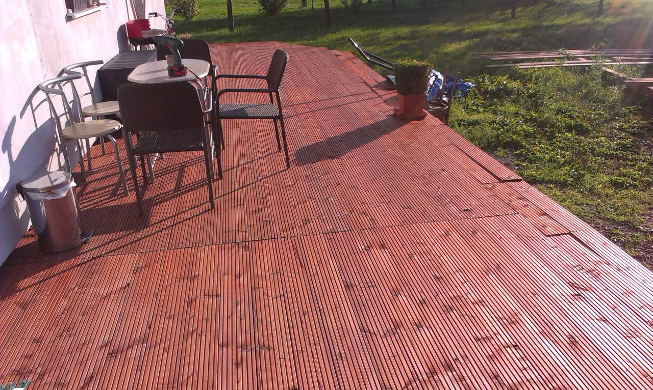 Na terasu som použil vrúbkované a nie hladké dosky, navyše neštandardne hrubšími drážkami smerom hore, pretože sa nám to so ženou viacej tak páčilo. Toto vrúbkovanie podobne ako všetky výraznejšie pásy opticky zkracuje ak by bolo kolmo na dom. Áno terasa má 11m a možno niekto povie, že optické skrátenie nevadí. Ale pri pokusných položeniach dosiek sa nám to tak nepáčilo, takže dosky šli tak ako majú ísť, čiže pozdĺžne s domom. Pri 3 ks po 4m je nemožné a zbytočné robiť akýkoľvek spád, keďže terasa je dimenzovaná tak, aby voda cez ňu prepadala smerom do zeme. Áno moje riešenie ma jednu nevýhodu, že pri zachovaní roviny sa voda drží dlhšie na doskách a som si toho vedomý, ale po niekoľkých mesiacoch môžem povedať, že to nie je vôbec také strašné.