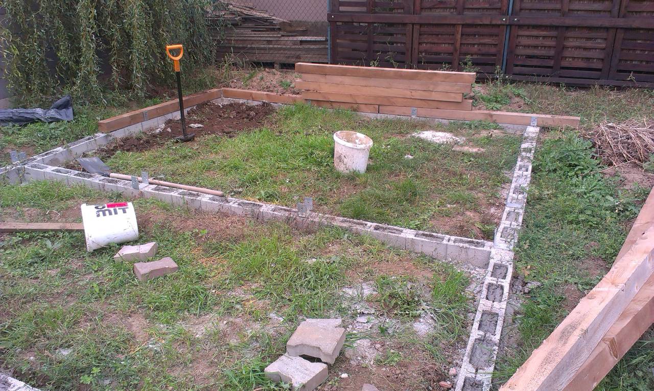Zvolil som si kompromis, cenovo aj pocitovo a to základy tvorené DT profilmi (šalovačky), ktoré som mal „skladom“, keďže som sa chystal robiť základy na plot. Takže som si vykopal jarok, ktorý som trošku "vystlal" štrkom frakcie 16-32 a začal ukladať jednotlivé šalovačky. Tu sa ako pomerne veľký problém ukázalo držať profily v línii a vo vodováhe. Po mnoho pokusoch som zistil, že centimetrové rozdiely proste vždy budú a so slovami, že ide o búdu na náradie som ich vyplnil do 3/4 betónom. Do rohov a potom cca každý 1m, respktíve 1,5m na druhej strane som vsadil U profil ako základ pre oporné body. Opäť som mal problém udržať U profil vo vodováhe a ešte ich mať v rovine aj medzi sebou. Dodatočne som si uvedomil, že ak bude jeden profil o 1cm vyššie, tak len proste skrátim jeho oporný hranol o 1cm a opäť mám rovinu. Tu sa trošku ukazovali nevýhody ak človek nemá žiadneho pomocníka.