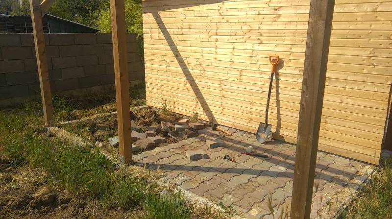 Známy vyhadzoval asi 50m dlažby a tak som kúpil za 50 eur (aj s dopravou iba som to musel vyložiť u seba) a tak som sa rozhodol použiť ju ako podklad hoci pôvodne som uvažoval o drevennej podlahe. Odkopal som časť zeme a zasypal tenkou vrstvou štrku frakcie 16-32. Ako sa neskôr ukázalo vrstva štrku bola viacmenej zbytočná. Tu som spravil maličkú "chybu" a to, že som sa pokúšal držať dlažbu v absolútnej rovine, takže som sa hral s každým kúskom neskutočne dlho.