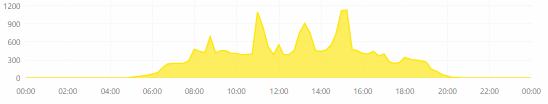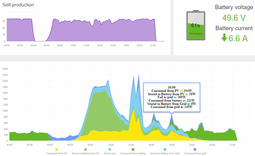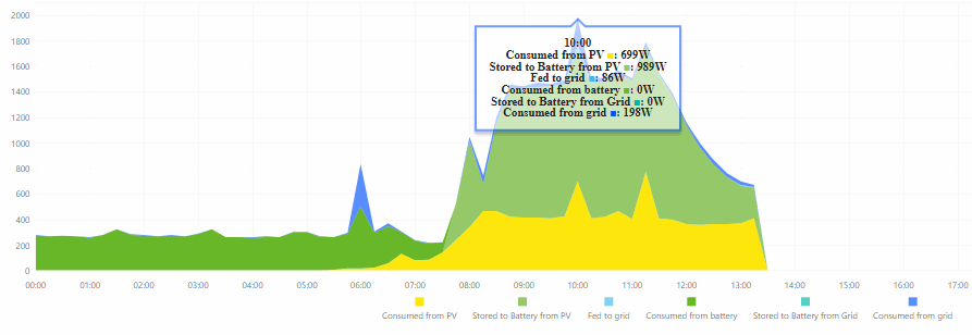 Na začátku dne je vidět provoz z baterií, jakmile napětí baterie kleslo pod stanovenou mez, provoz se přepnul na síť. Zhruba od půl sedmé začínají fungovat panely a dodávat energii, kolem 7:00 už je dost energie na to, aby se začaly dobíjet baterie. Kolem 11:00 je vidět, jak klesá proud při nabíjení baterií, aby se dodržela charakteristika nabíjení. Kolem 12:00 nastal čas vaření - v té chvíli stačila pro sporák energie z panelů, dobíjení baterií se pozastavilo. Pak jsou tam nějaké špičky ve 14:00 a 16:00 - 2kW varná konvice. Když si najedete na libovolné místo grafu, dozvíte se konkrétní informace.