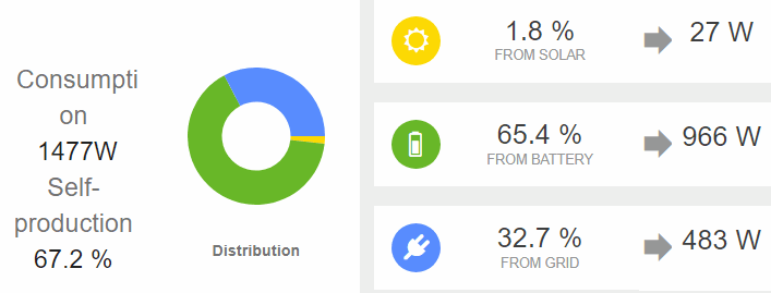 Při chodu na baterie má měnič vlastní spotřebu 100-150W. Pokud je k dispozici energie ze solárních panelů, je vlastní spotřeba vykryta z panelů. Pokud není k dispozici slunce ani baterie (vyčerpali jste do nastaveného limitu), přepne se spotřeba na síť - vlastně jde síť přes měnič a v té chvíli je vlastní spotřeba měniče jen desítky watů - běží jen vnitřní počítač.