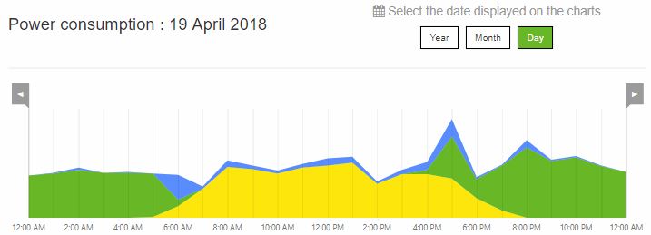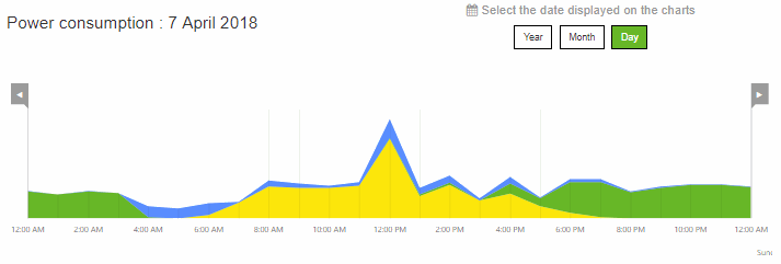 Výstup jedné z mnoha statistik - přehled spotřeby ze 7.4.2018. Je pěkně vidět, jak se vliv elektrárny projevuje na spotřebě domácnosti, kdy se spotřeba vykrývá z panelů, kdy z baterií a kdy se doplňuje ze sítě.