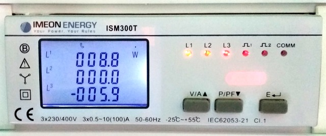 Obrázek z rozvodné skříně - Smartmeter v praxi. Na každé fázi vidíte, jestli proudí energie k vám nebo ven a kolik. Dá se zobrazovat napětí, proud, jalový i účinný výkon, změny atd.