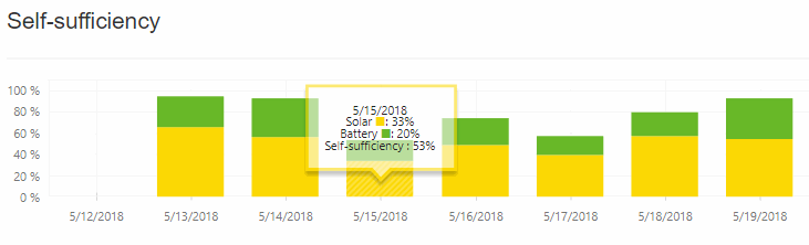 Průběh hodně špatných dnů 15-17. května, kdy byly celý den černé mraky a déšť. Normálně se self-sufficiency (soběstačnost) pohybuje okolo 93%. Když bylo hodně špatně, klesl jsem na 53%. Znamená to poměr, kolik energie si vyrobíte a kolik spotřebujete ze sítě.