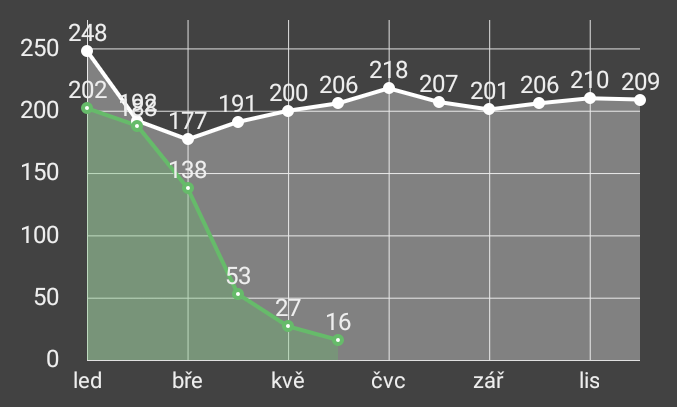 Po několika měsících graf, tentokrát z odečtů elektroměru. Bíle rok 2017, zeleně rok 2018.