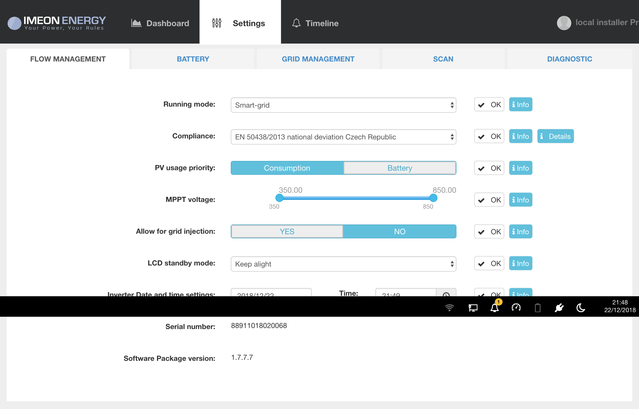 Situace se pomalu stabilizuje .... momentalne verze 1.7.7.15 ... problémy postupně reportuju na dodavatele a distributora ... obratem se odesilají výrobci a zakládá servisní tiket. Spotřeba je hodně vysoká, ale snad ji časem výrobce optimalizuje. Dodávku do gridu máte jen z údajů IMEONu nebo přímo z elektroměru ? To co pozoruji tak jsou v tuto chvíli jednotky ´max desitky wattů... a to mam potvrzeno z průběhového měření u CEZu ...