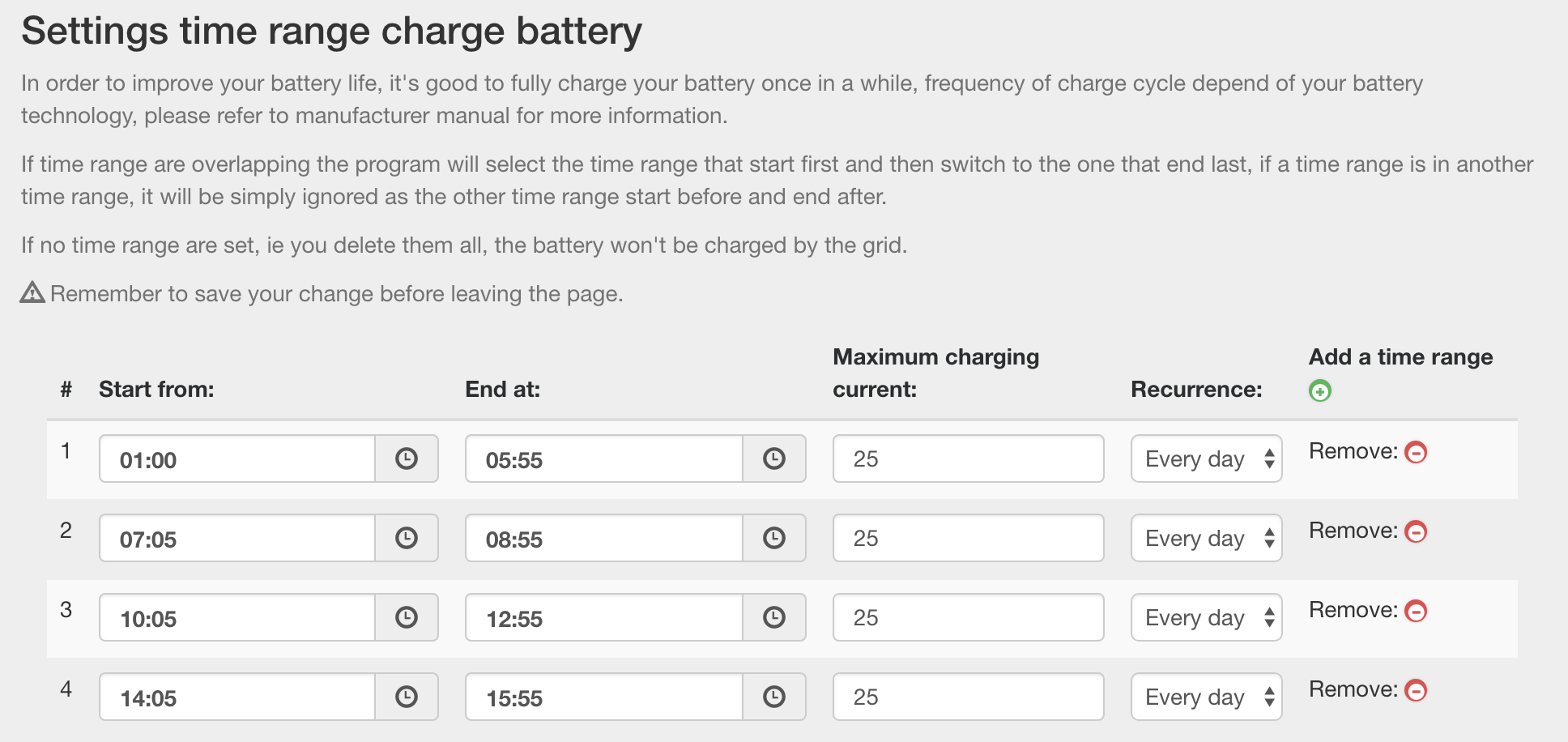 Ahoj, taky využívám Imeon 9.12 + 3x baterie Pylontech LiFePo4 a řeším situaci jak teď v zimě (když sluníčka moc nemáme) nastavit alespoň nabíjení baterií ze sítě tak, aby se využívala spotřeba domácnosti ve vysokém tarifu z baterií, který mám v těchto časech 06:00 - 07:00, 09:00 - 10:00, 13:00 - 14:00, 16:00 - 17:00 (dodatel ČEZ). Nastavení přikládám v příloze. Ale nějak mi to furt nefunguje. PS: hlavní spotřeba teď v zímě u nás má vytápění přes tepelné čerpadlo. Předem díky za tipy.