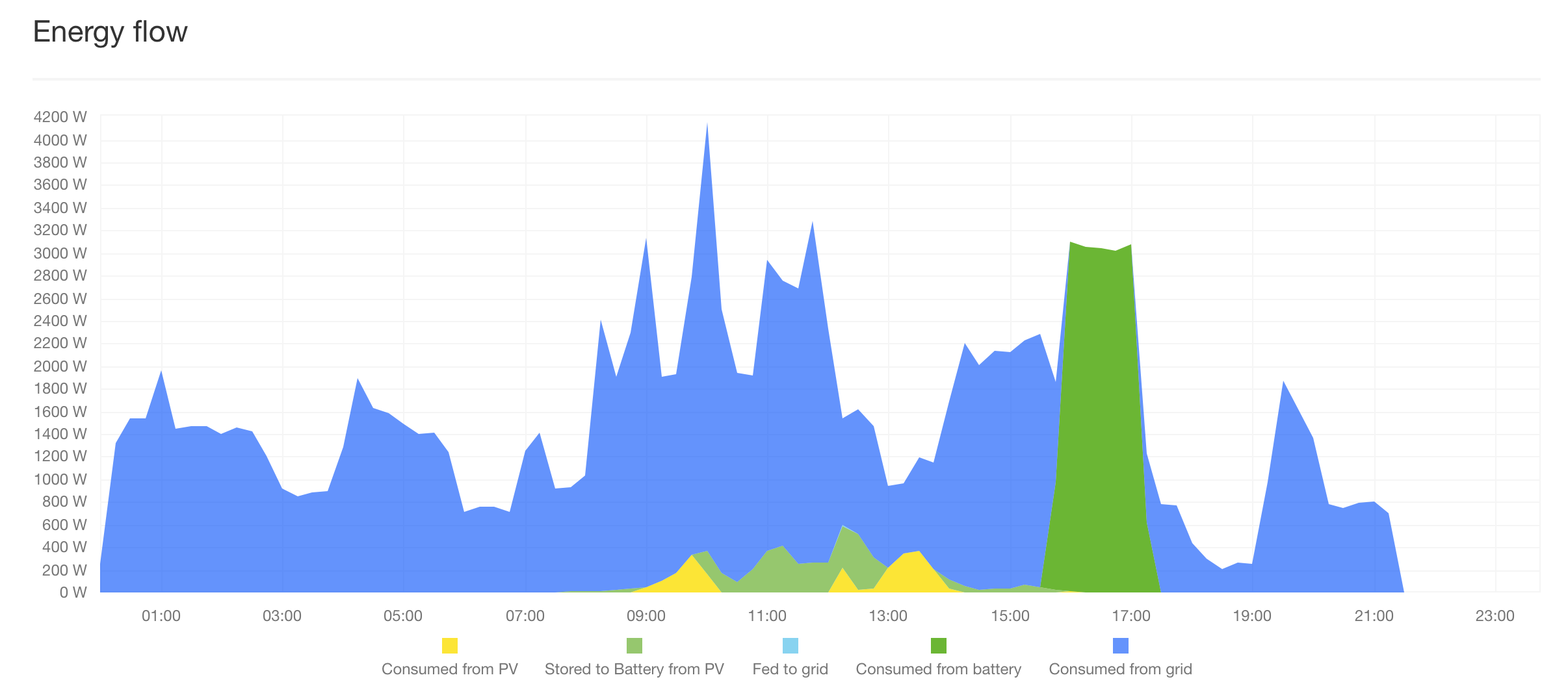Zhruba do 13:00 se dobíjí baterie, žlutě je vidět spotřeba domácnosti - vaření kolem poledne, pečení chleba ve 2 hodiny a celkově zvýšená spotřeba díky klimatizaci. Modře jsou vidět přebytky vyrobené energie, které jdou zpět do sítě.
