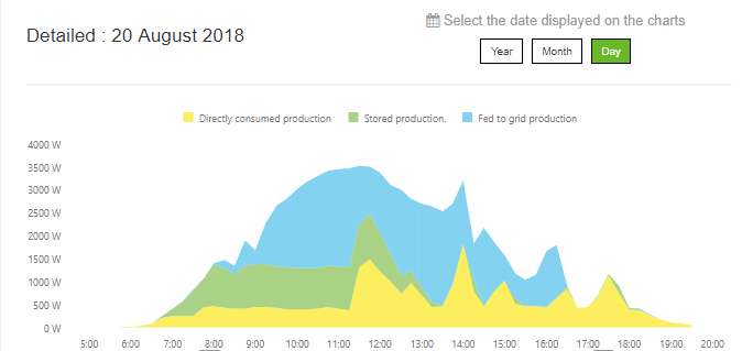 Zhruba do 13:00 se dobíjí baterie, žlutě je vidět spotřeba domácnosti - vaření kolem poledne, pečení chleba ve 2 hodiny a celkově zvýšená spotřeba díky klimatizaci. Modře jsou vidět přebytky vyrobené energie, které jdou zpět do sítě.