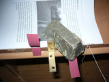 Takže máme nasnášené složky seřazené za sebou. Připravíme si rovnou podložku – používám už výše zmíněnou desku ze staré obývací stěny. Koneckonců, používám ji na všechno. Pro přesné rovnání složek můžeme na desku přidělat dorazy. Ze strany, abychom přesně rovnali knižní blok v hlavě a zepředu, abychom přesně rovnali hřbet knihy. Na fotografiích používám jeden doraz pro rovnání hřbetu. Není ale nutné dorazy používat, pokud budete dostatečně šikovní, obejdete se i bez nich.