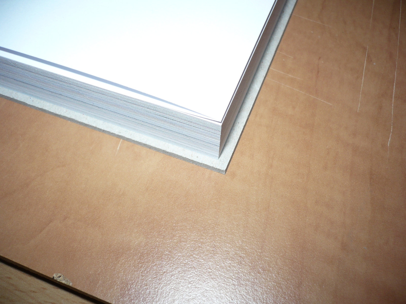 V této fázi byste měli přesně zjistit, jak by měly být desky dlouhé, případně je upravit. Hřbet i mezery jsou dané a upravujeme pouze obě desky tak, aby přesah bloku byl v hlavě, nohách i po straně stejný - tedy žádané 3mm. V ideálním případě jsme od počátku počítali dobře a nemusíme upravovat nic.
