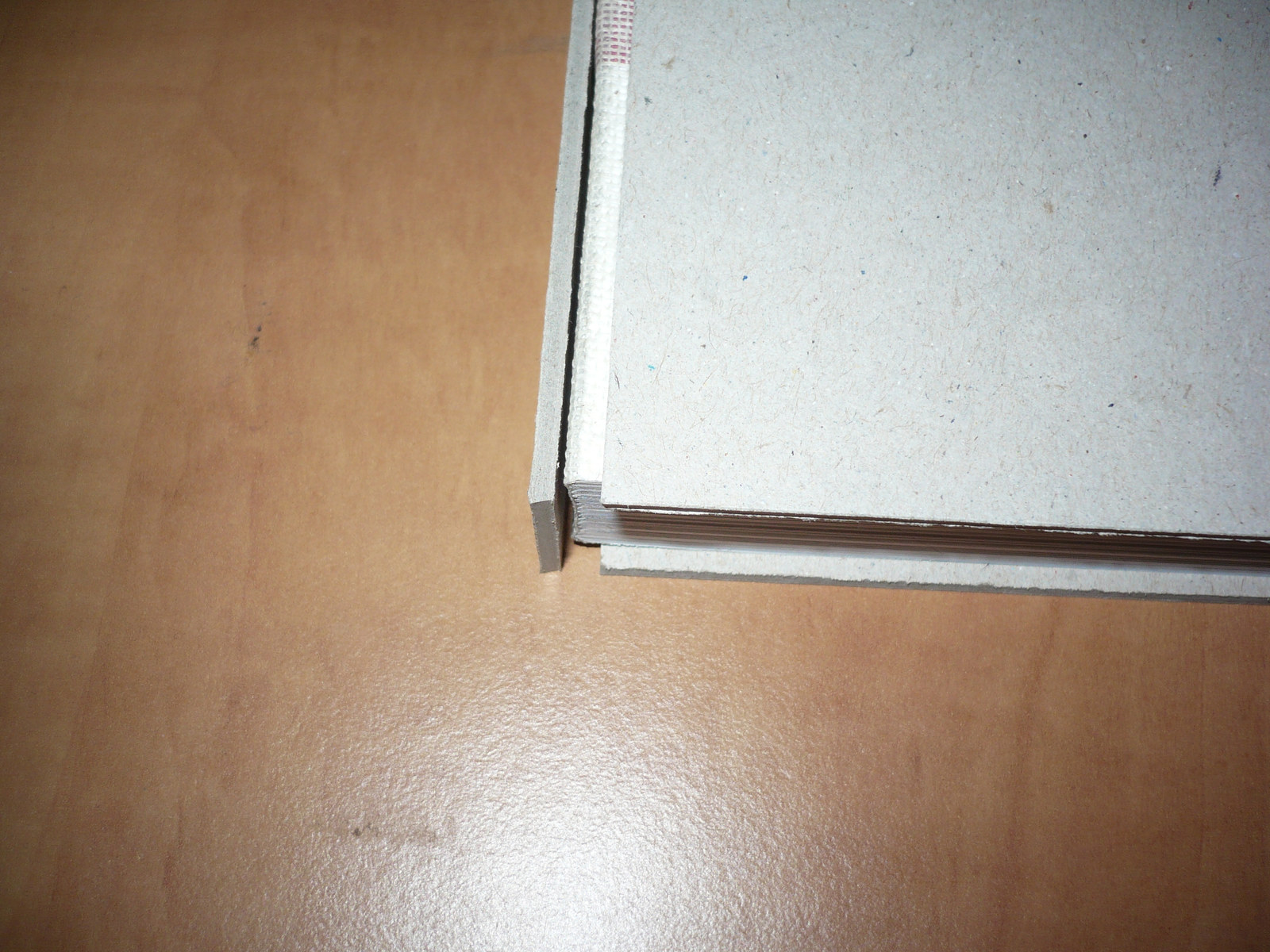 Na fotce vidíte i seříznutí bočních chlopní. Neseřezávejte hned od rohu desek. Nechte 2mm na hranu lepenky a další 3mm, aby „diagonál“ začínal až s knižním blokem.