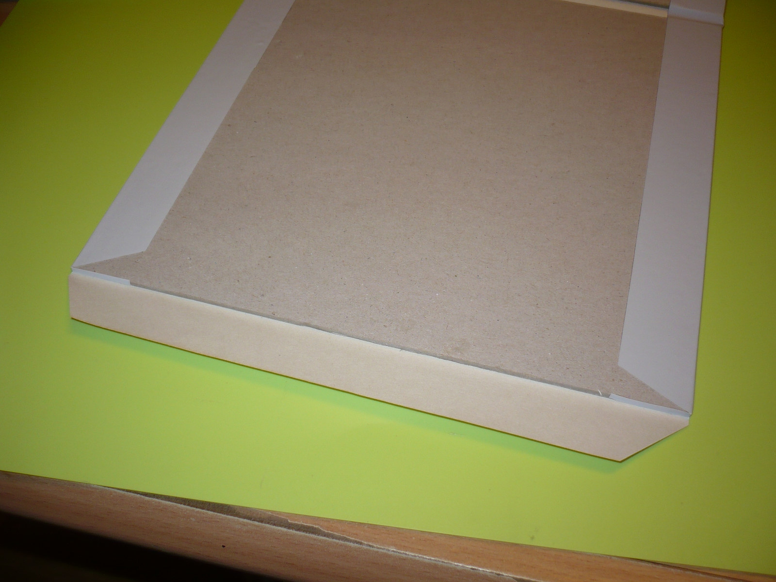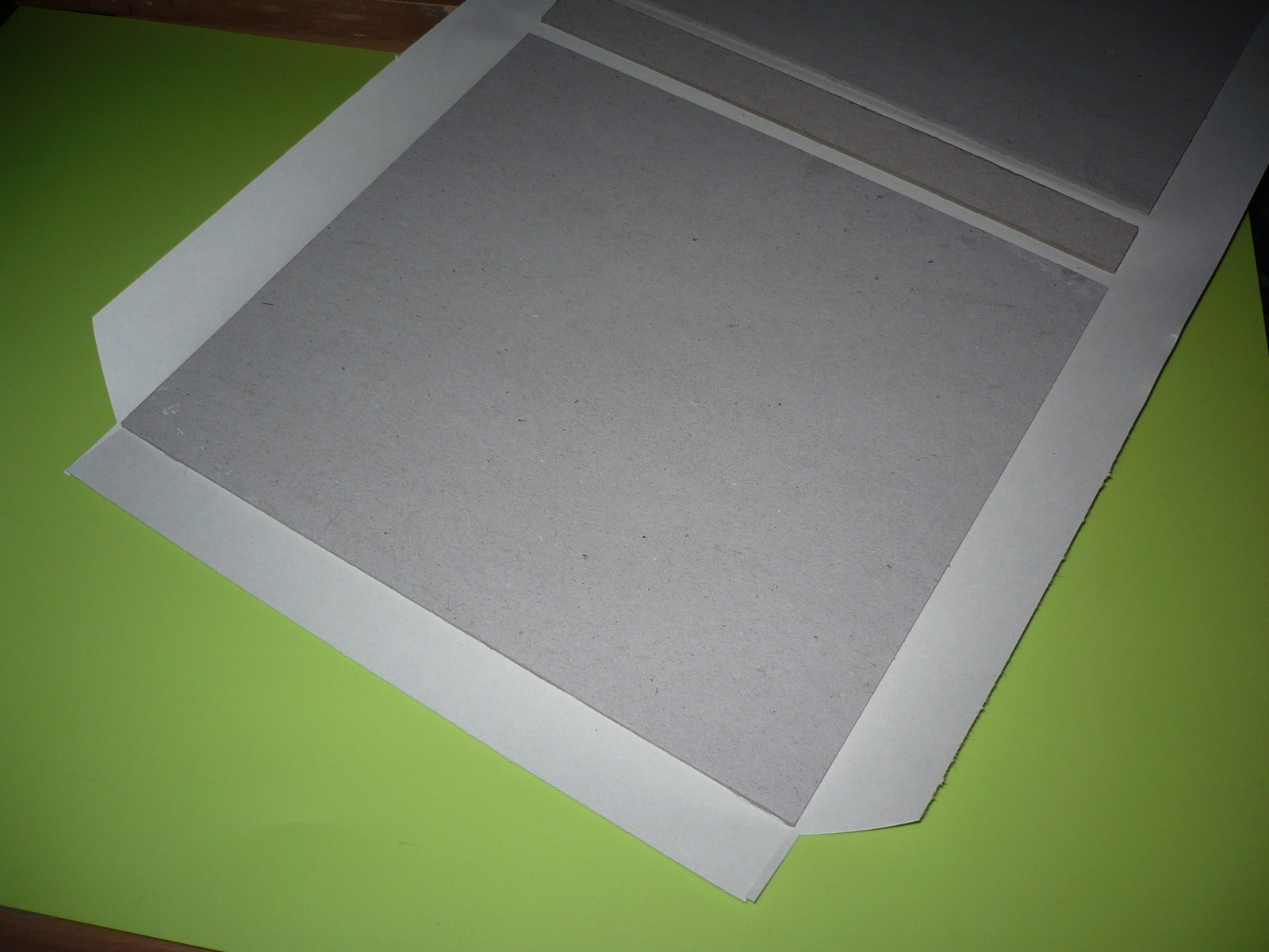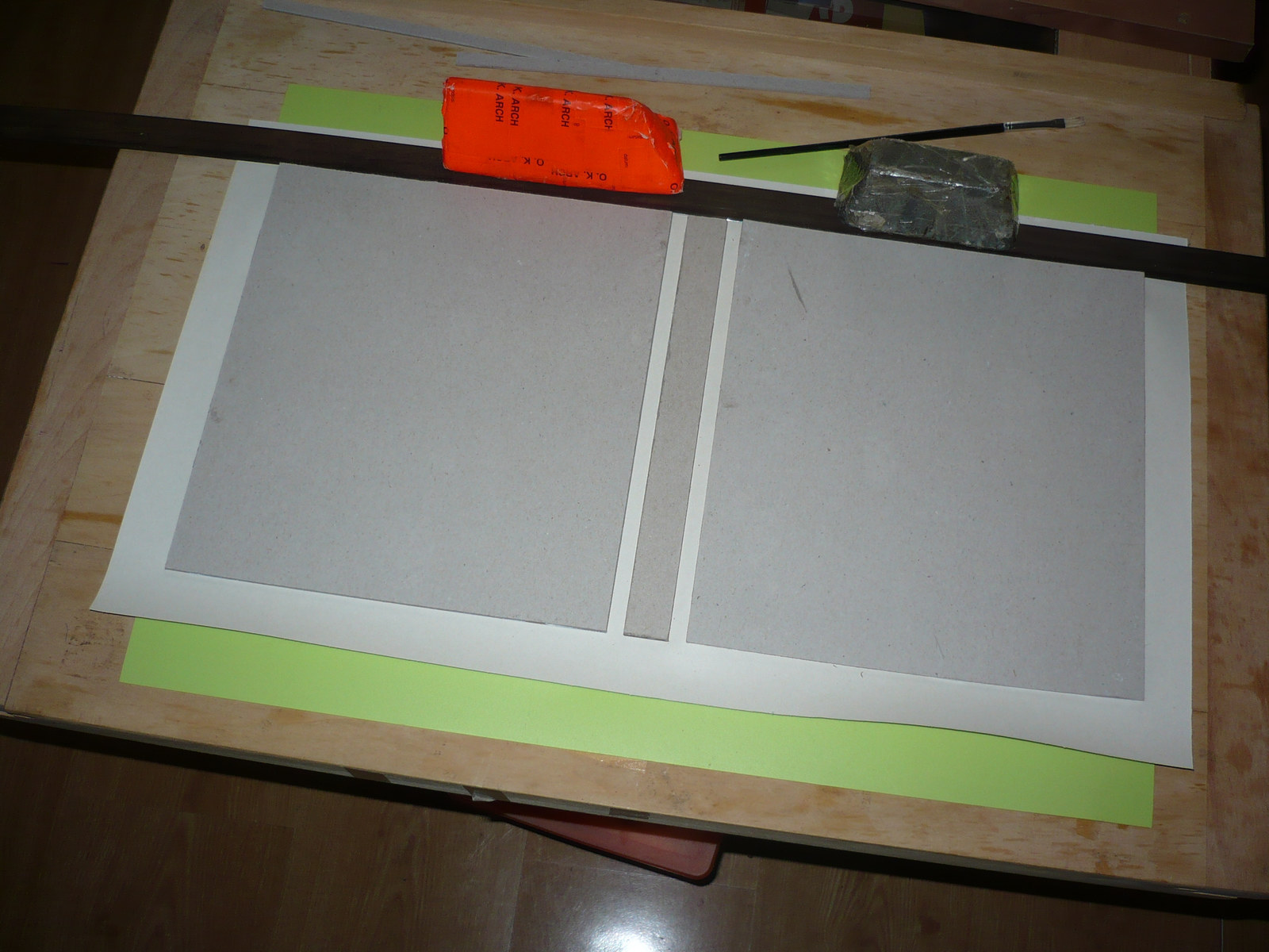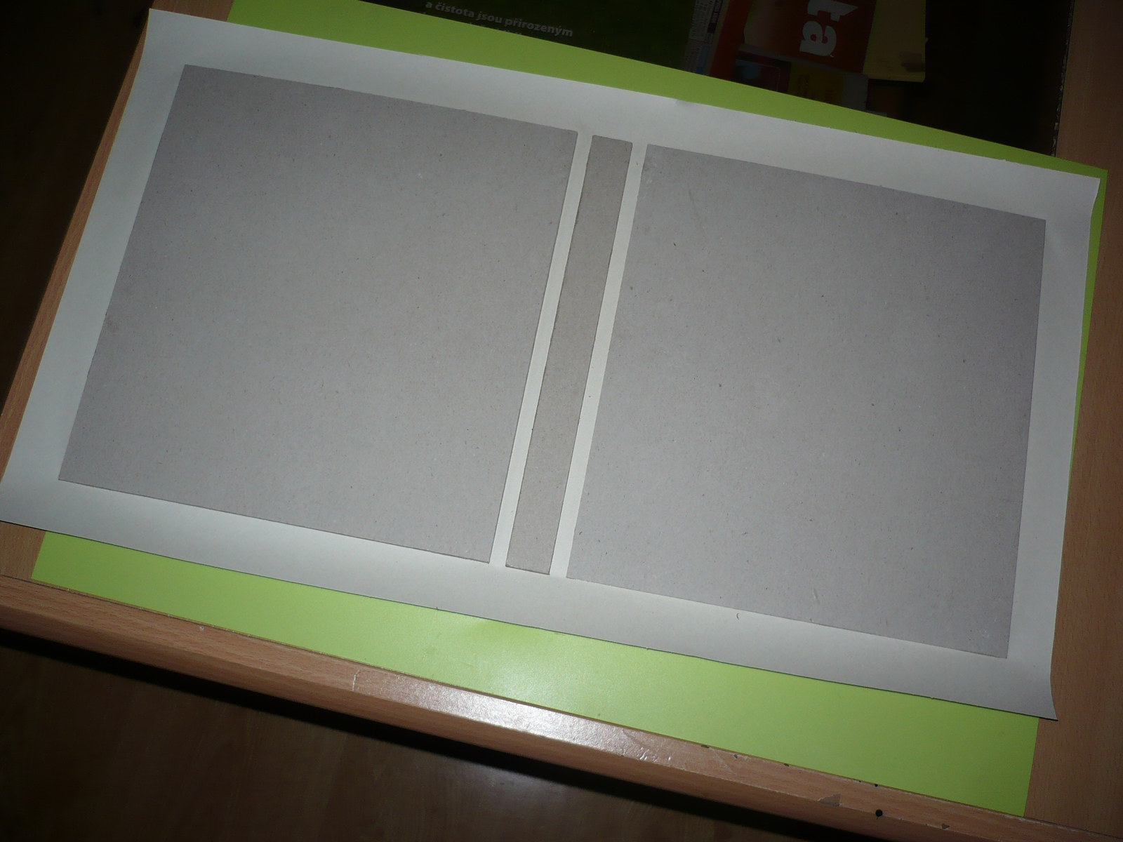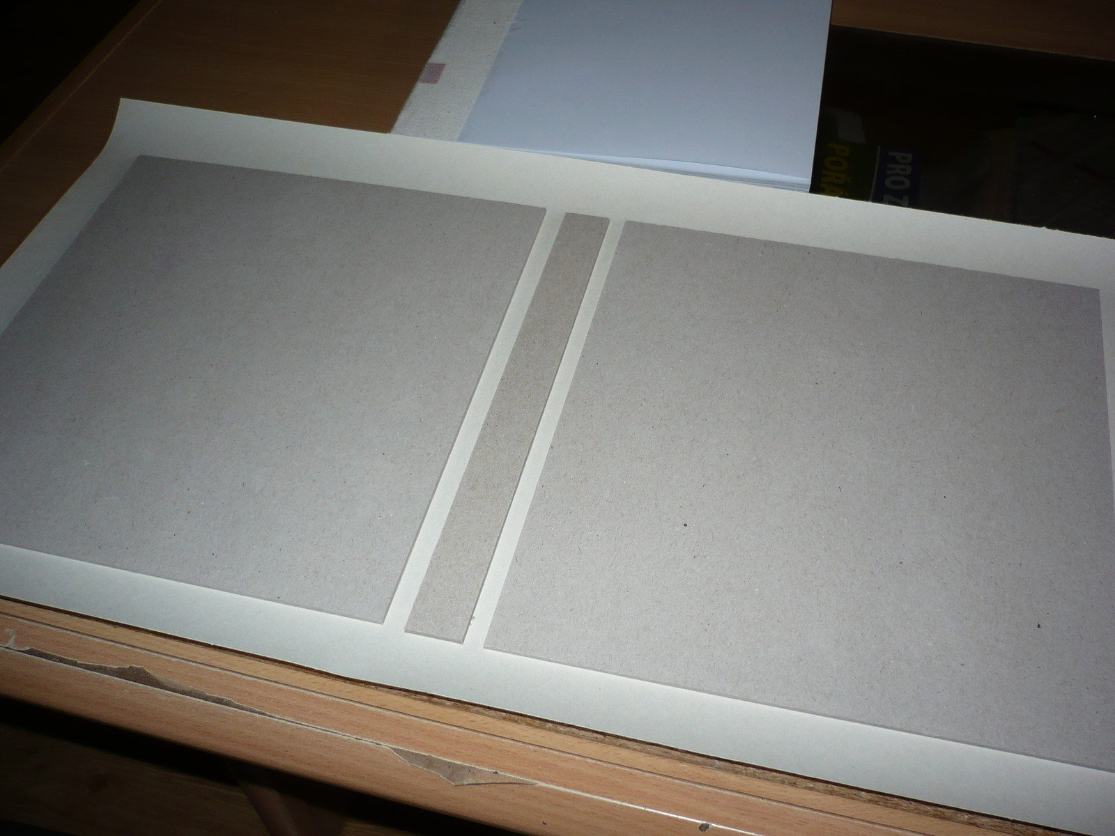 Nařezání potahu pro lepení spodní a vrchní chlopně. Myslím, že je systém dostatečně jasný. Pro zakrytí růžků (lepenka je 2mm silná a bez krycích proužků by vám přesně v růžcích mohla z přebalu svítit lepenka) jsem nařízl vždy nahoře a dole 2mm široké proužky (tloušťka desek). Zalepení uvidíte na následujícím fotu.