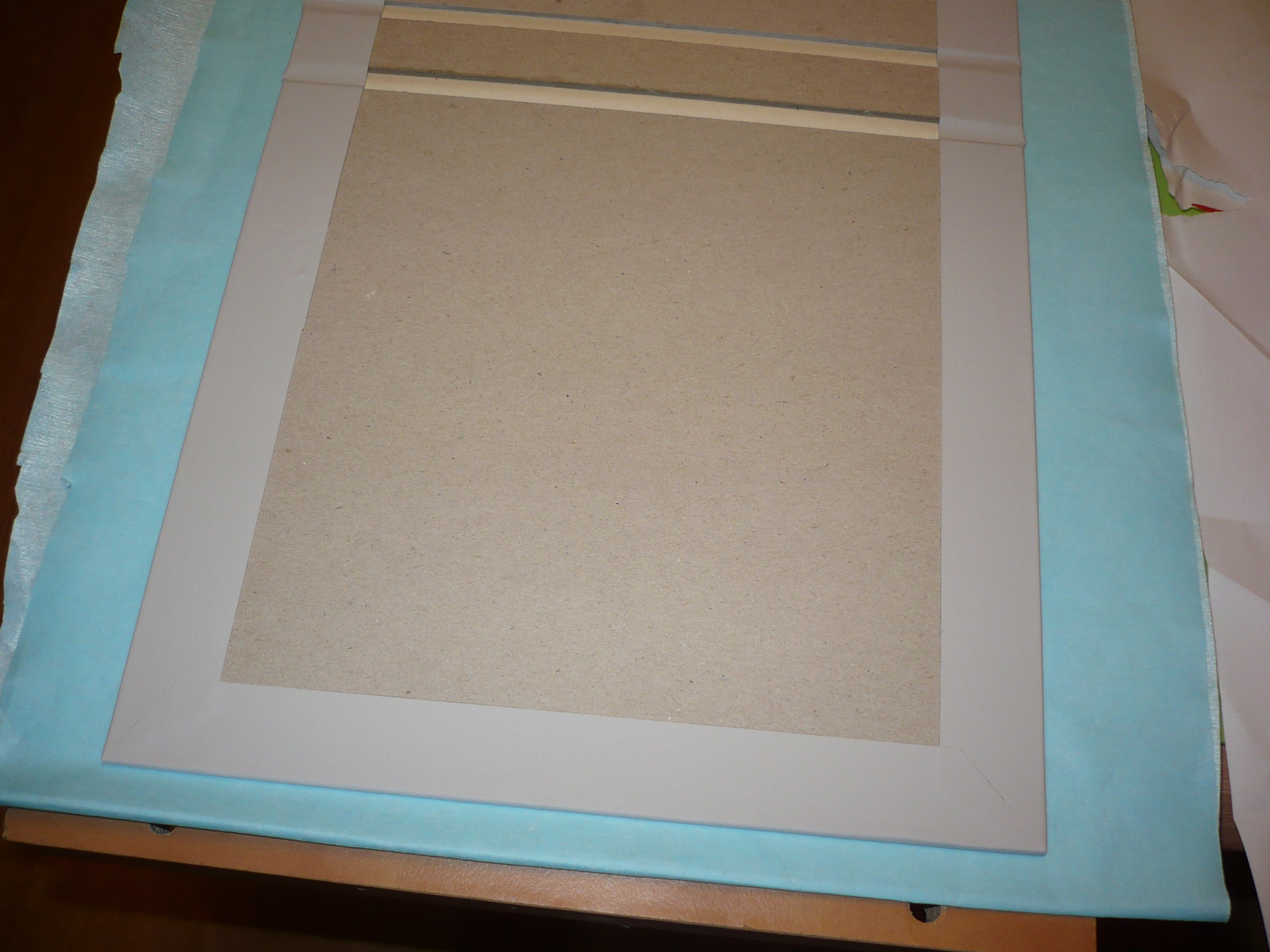 Zprava doleva nalepeno. Pečlivě umačkejte rukou, abyste dostali ven větší množství přebytečného lepidla. Pak ho pečlivě na hranách lepenky odstraňte, aby nikde nezůstaly kapky. Kdyby tam zůstaly, tak by zaschly a mohly by na konečném potahu vytvořit ošklivé bouličky. Po usazení a přilepení nenechávejte pomocné pruhy na místě, ale odstraňte je.