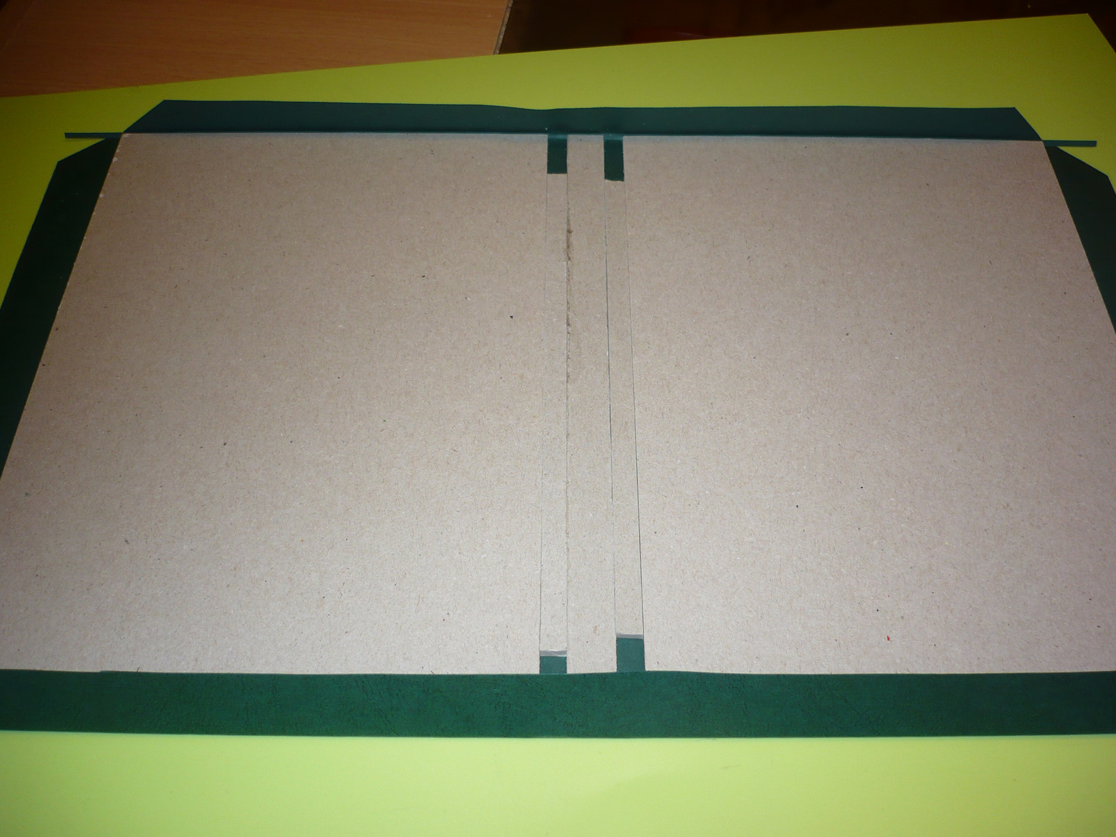 První přikládání a kontrola rozměrů desek. U foto 2 můžete vzít pravítko a zkontrolovat rozměry pomocných pruhů 8x286 – vzdálenost vnější hrany hřbetu a vnitřní hrany desek.