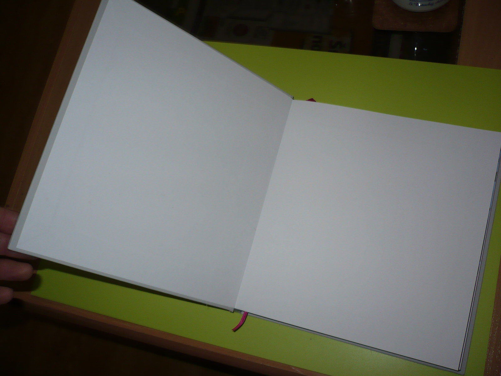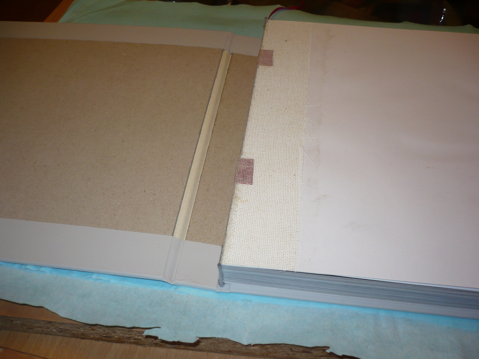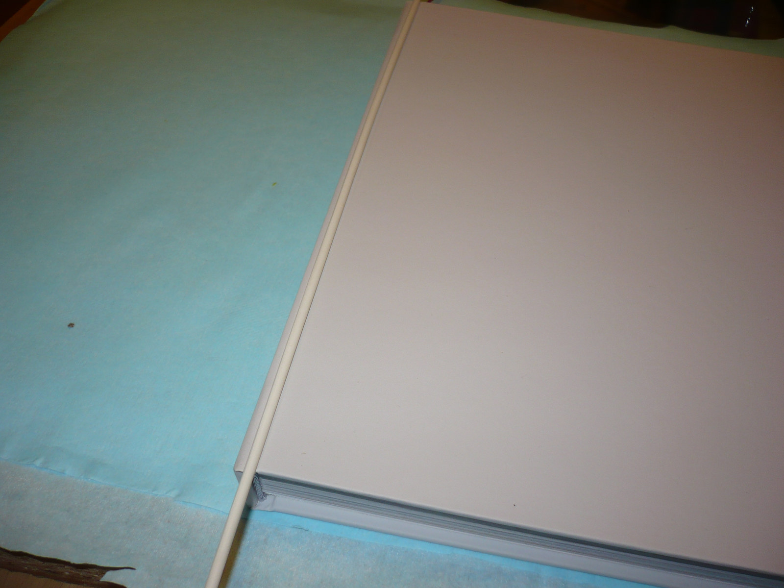 Otevřeno na předsádce. Tady je vidět, že něco radím a něco jiného činím. Předsádka je otočená napříč vláknem, takže se na konci roztáhla asi o 1,5mm. Na dolní hraně je celkem rovnoběžně s deskami, nahoře utíká diagonálně k okraji. S tím už po přilepení nemá cenu moc něco dělat. Dá se, teoreticky, opatrně odříznout papír předsádky (nezaříznout do potahu, že) a ten dlouhý trojúhelníček sloupnout. Je to ale dost náročná operace s nejistým výsledkem. Druhá chyba je, že jsem určil příliš dlouhou desku pro přebal a přesah přebalu přes knižní blok je výrazně větší po straně, než nahoře a dole. Výpočty pro rozměry v článku jsou ale správně, to jen já jsem byl líný po kontrole rozměrů desky zkracovat. Jsou to chyby, aspoň je vidíte.