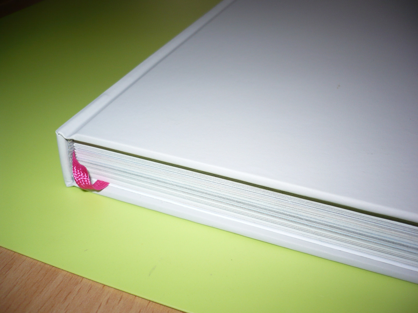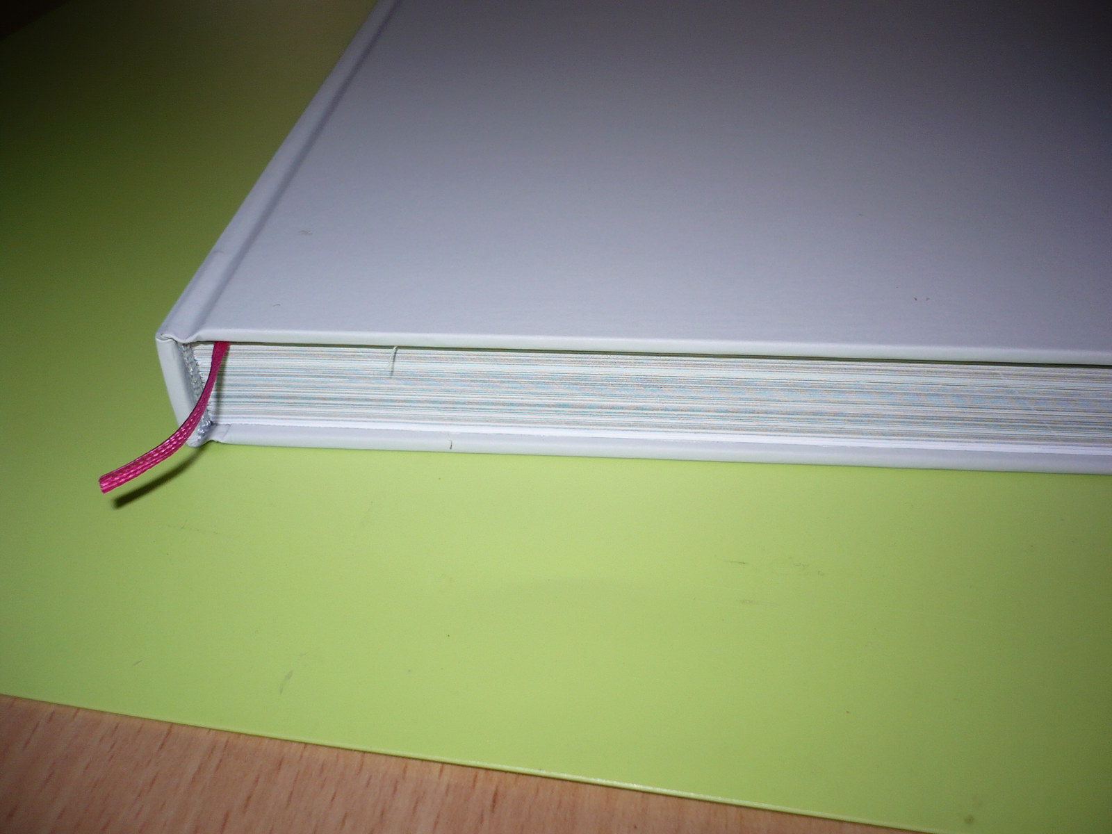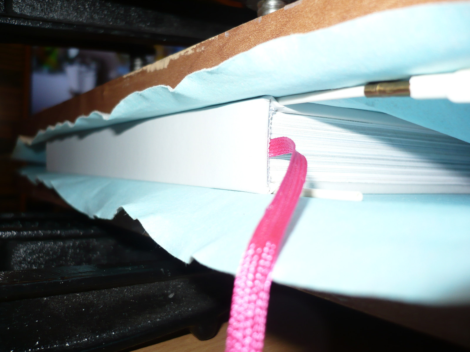 Hřbet dole a nahoře. Je dobře vidět kapitálek, umístění záložky, prolomení přebalu v ohybu a vůbec vytvarování přebalu. Na první fotce trčí z desek nit. Tak je z gázy, občas se stane, že po ořezu bloku nějaká nitka vyleze. Lehce odstranitelná závada – odřízneme sklapelem. Na hraně hřbetu přebalu je také vidět mírné vydutí v délce cca 3cm. To je vnitřní část přebalu, takhle maličko po slepení vyleze, protože je potah ty tři centimetry na hřbetu vlastně dvojmo. To je to jak jsem říkal – nic neodřezávejte a neupravujte. Opravdu to nemá cenu. Zkoušel jsem to. Zbavil jsem se části vnitřního potahu na těch dvou milimetrech tloušťky hřbetu, ale zase ten volný kus potahu - v osmi milimetrech mezi hřebetem a deskou - se nehezky odchlípl. Odřezáváním částí přebalu byste také ztratili část pevnosti desek a nebude to vypadat o moc lépe. Lepší je tedy zachovat chlopně před zalepením nahoře i dole stejně široké a rovnoběžné, aby to vydutí bylo symetrické. Ve skutečnosti není zdaleka tak výrazné, blesk fotoaparátu toho hodně vytáhne. Pokud použijete pro potah tenčí materiál, než ten Baladek a budete mít přebal s nějakou kresbou, která každou nepravidelnost bude rušit, vydutí prakticky neuvidíte.