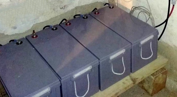 1. olověné akumulátory 4ks 200Ah. Celkové napětí 48V, celková kapacita 9,6kWh