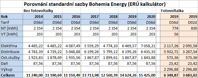 V tomto porovnání si vezmeme stejnou spotřebu, tarif D56d s jističem 3x25A a aplikujeme na ni standardní sazbu Bohemia Energy. Předchozí roky jsem použil jen pro porovnání nárůstu ceny - je vidět, jak roste vlastní cena elektřiny a cena distribuce. Na konci je porovnání se skutečnou spotřebou a standardní sazbou BE při použití fotovoltaiky při sazbě D56D a D02D.