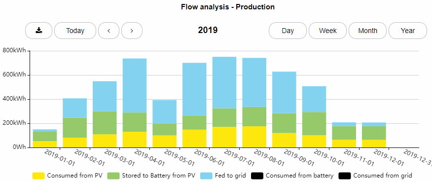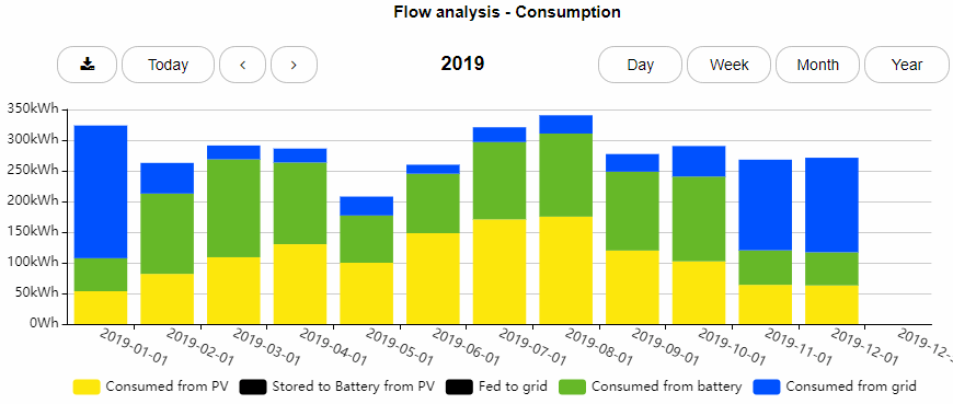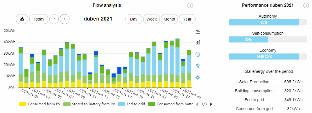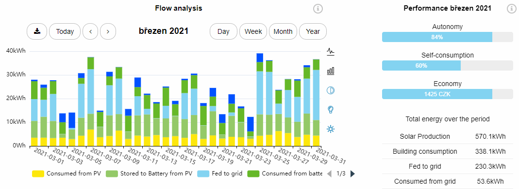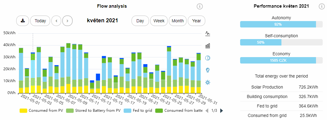 Žlutá je pokrytí spotřeby domácnosti fotovoltaikou, zelená je pokrytí spotřeby domácnosti z baterií a modrá je spotřeba ze sítě.