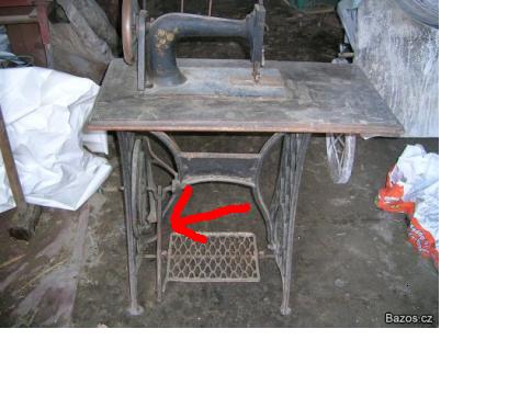 Řemen spojuje to veliký kolo dole s menším přímo na šicím stroji, ten snad nepřehlédnete. Mluvil jsem o něm jen v souvislosti s tím "dřevěným kouskem", protože nevím, jak by se "dřevěný kousek" dal napasovat jinam. Pokud tam řemen je, tak na tuhle moji poznámku zapomeňte.