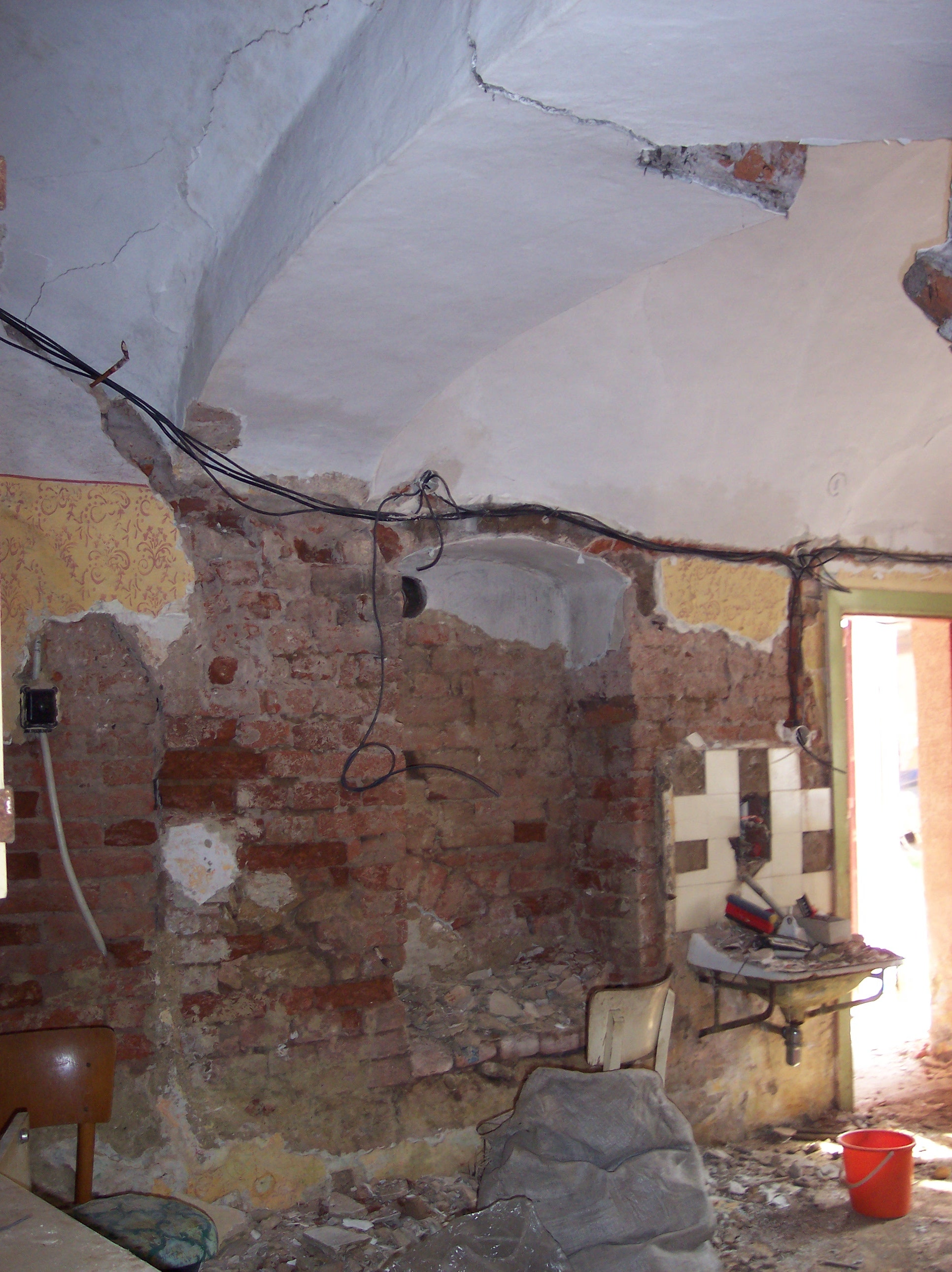 Vypadlo to částečně pohybem stěn, ale rozhodně tam byl zásah při zasekávání elektriky a lustruháku, takže bych to neviděl tak dramaticky. A komín (odbočku) někdo zasekával přímo pod dotčenou klenbou, je tam vidět zabílená stará poklička.