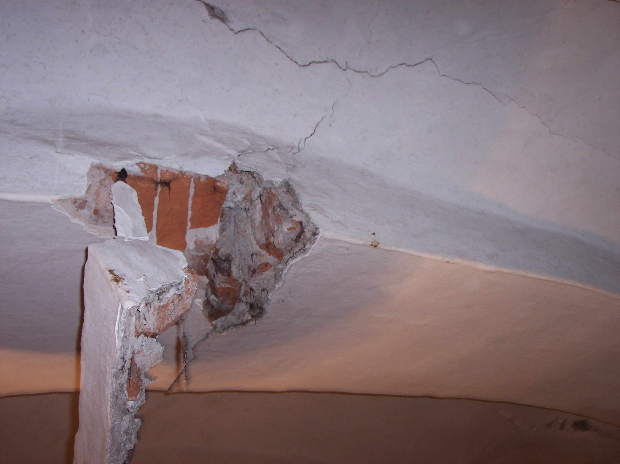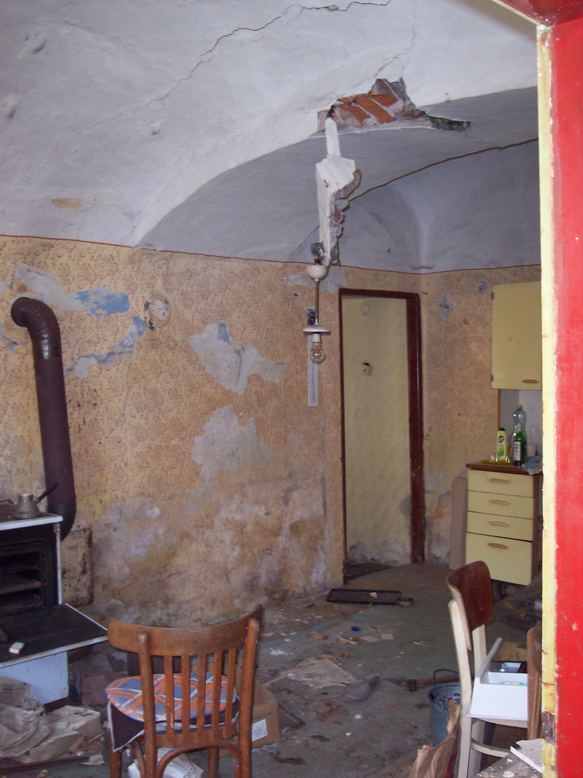 Vypadlo to částečně pohybem stěn, ale rozhodně tam byl zásah při zasekávání elektriky a lustruháku, takže bych to neviděl tak dramaticky. A komín (odbočku) někdo zasekával přímo pod dotčenou klenbou, je tam vidět zabílená stará poklička.