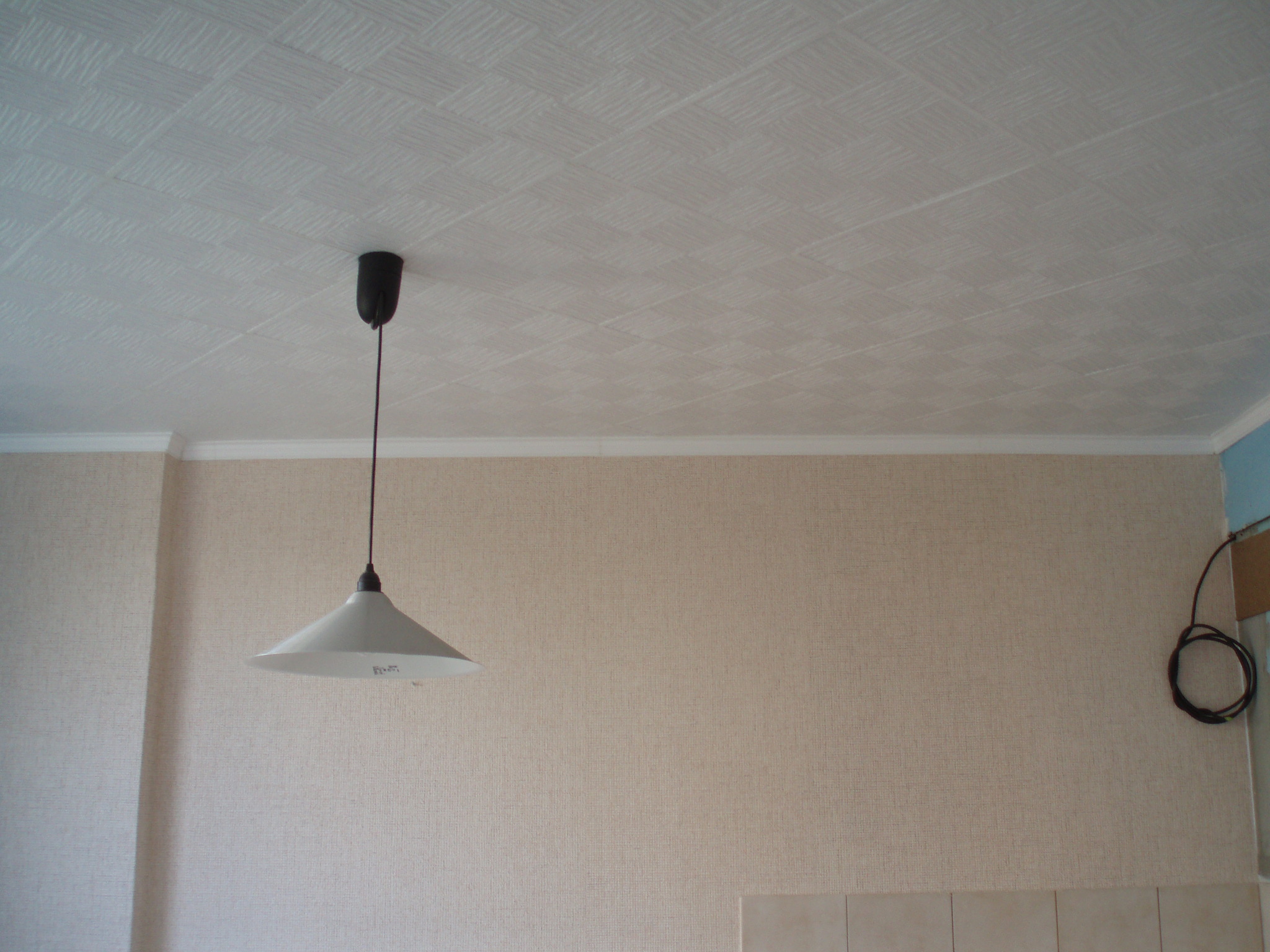 Lepení podhledů je výhodné začít od prostředku,lépe je pokládat čtverce od lustru a to na koso.Vyměřit vzdálenost od lišt.Ke krajům k lištám je nutno přířezy změřit opravdu přesně a seříznout trochu šikmo,aby se přířez musel trochu stlačit.