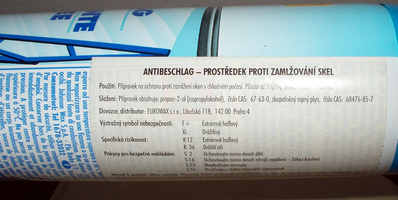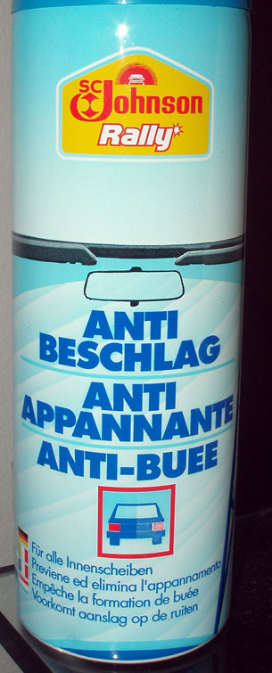 Jsem jednou koupil do auta nějakou obdobnou (tuto ne) sprej Anti-blééé a na sklech se udělal hnusný mýdlový povlak, který když nastala atmosféra pro mlžení skel, začal odněkud příšerně pěnit a bylo vidět taky kulový. V noci i za sucha to dělalo od protijedoucích světel dělalo děsné reflexy, že to až bylo nebezpečné. Nechtěl parchant z toho pryč, drbal jsem skla jak cvok, než jsem se toho zbavil. Sprej letěla obloukem přes zdivo sběrného dvora, na rozloučenou doprovázená hojností nadávek. Možná jsem toho tam nacamral moc, možná to bylo od čínského výrobce. Chci věřit, že v době moderní chemie někdo dokáže vyrobit i použitelnou věc.