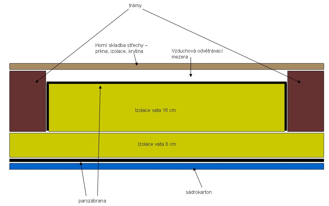 Nad sádrokartonem je pultová střecha zateplená vatou jak mezi jednotlivými trámy tak i vrstva mezi trámy a sádrokartonem.