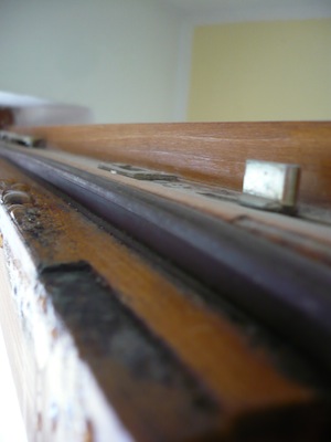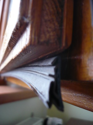 Hoši z firmy samozřejmě nedorazili, takže jsem pro začátek koupil obyčejné gumové (či jaké) těsnění za 20 Kč metr a udělal dorazové těsnění na interiérové straně. Rám je zatím krásně suchý, ale to se v tomhle březnovém počasí není čemu divit, musím počkat na mráz.