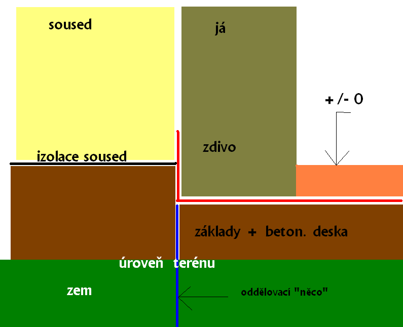 Vlevo soused, vpravo já. Rozdíl ve výšce základové desky je 20cm (soused je výš). Jedná se mi i vodorovnou izolaci na naši základovou desku (červená čára) - předpokládám, že bych ji u stěny souseda měl ohnout nahoru na jeho zeď, nad jeho vodorovnou izolaci (černá čára).