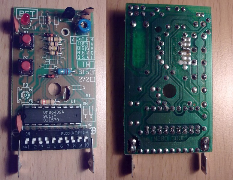 Zdravím. Otec vlastní garáž v poschoďových garážích (nevím jak to nazvat, prostě budova, několik pater a desítky garáží uvnitř), dole jsou tam dvě brány pro vjezd a výjezd a ty jsou ovládány klíčkem, nebo dálkovým ovladačem se dvěma tlačítky. A protože garáž občas využiju i já (pro svou motorku ale to není podstatné..), chtěl bych si vyrobit kopii toho ovladače, čistě z pohodlnosti. Přidávám fotky plošňáku. Potřebuju poradit, jestli bude možné sehnat všechny součástky. Odpory, kondíky, cívka to nebude problém, jde o ten integrák a "to" s "těma" přepínačema 1 - 10 nevím jak se to nazývá. A ještě dotaz, co je přesně anténa? to protáhlé U vlevo nahoře ve druhém obrázku? A je potřeba při výrobě zachovat přesné rozměry antény?