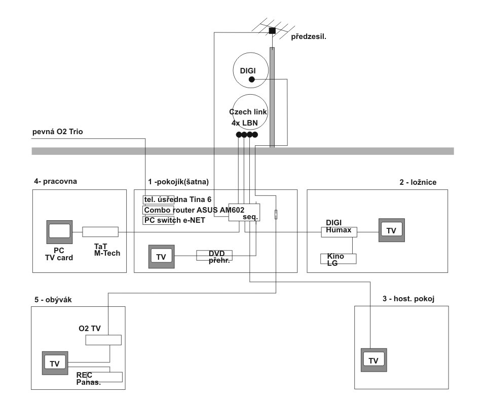 Pod střechou na půdě bude vyvedena elektřina pro případný zesilovač (či slučovač či jak se to jmenuje) a bridge pro příjem wifi internetu (z bridge cat-5/6 kabel do pracovny s routerem, od něj kabelová LAN po celém baráku). Na půdě taky budou ústit husí krky na koaxiály k jednotlivým TV zásuvkám.