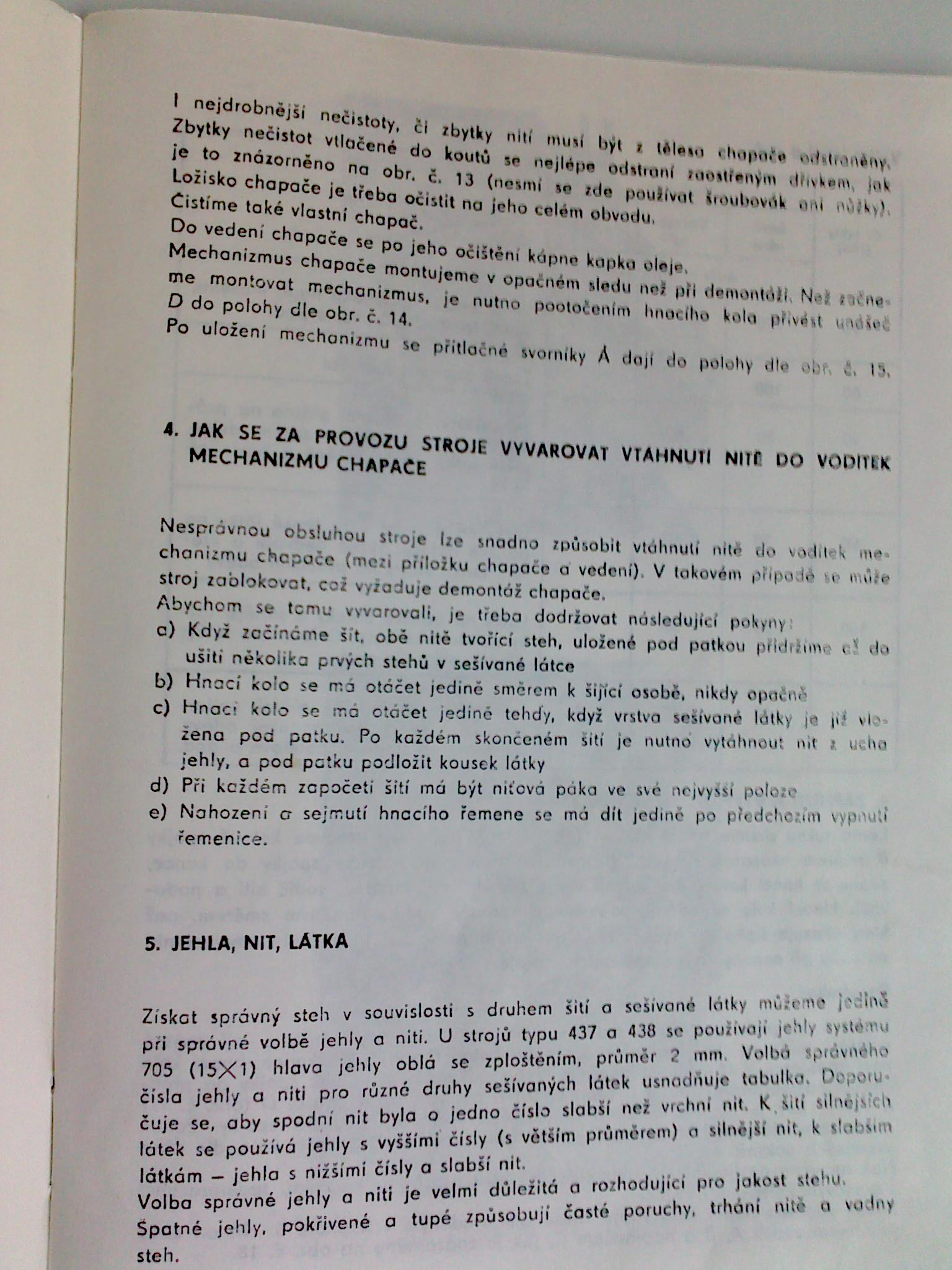 Mít při šití mazače, který by stroj v pravidelných intervalech běhenm šití mazal se mi zdá divoké. Možná by pomohlo vzít petrolej a stroj pročistit, vysušit benzinem a pak promazat.Při běžném šití použít nitě stejné síly, odborník může použít sílu různou a tah nastavit, typicky při všívání kloboukových gumek.Jehly jsou klasické, kalené Jeans a na kůži, případně dvojjehly.