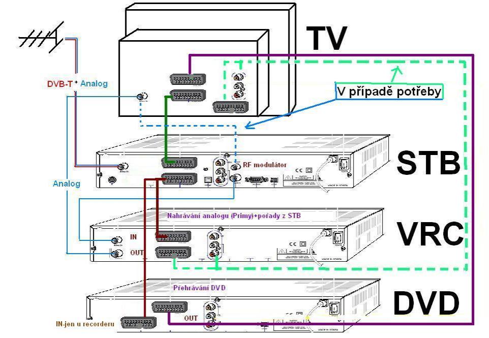 Zde je k dispozici k nahlédnutí schéma pro obecné zapojení všech uvedených zařízení (STB,TV, VRC,DVD). Schéma lze prakticky využít i pro varianty: