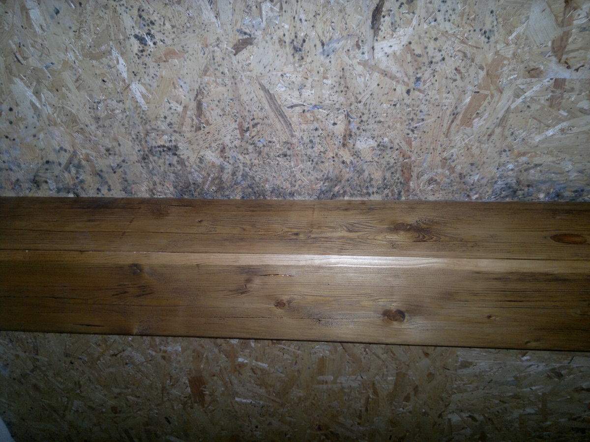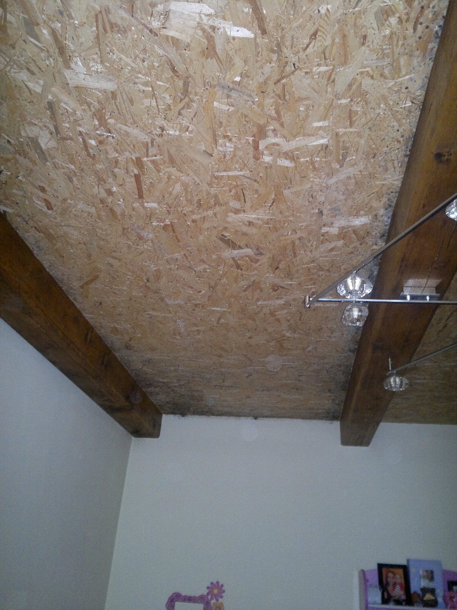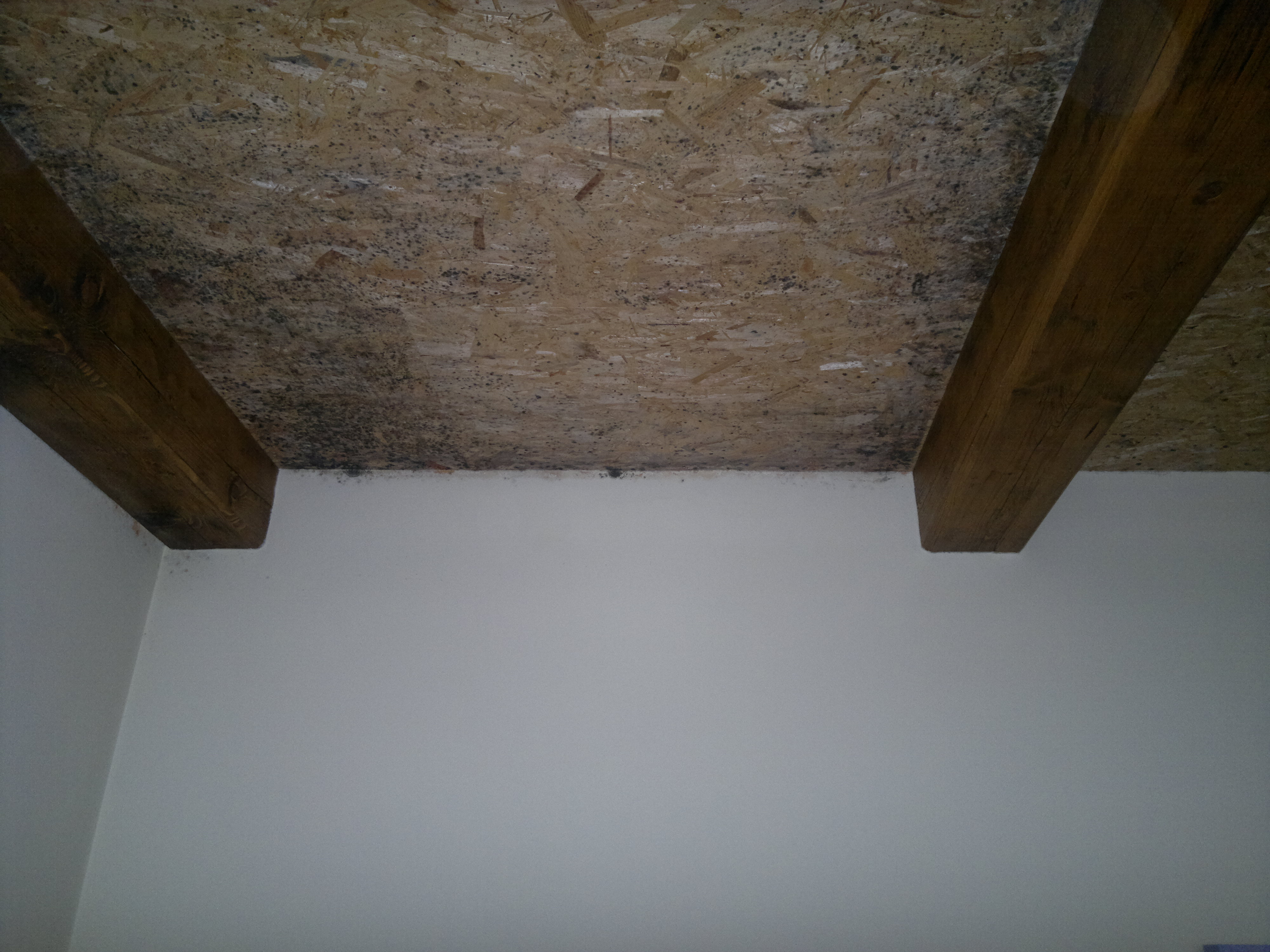 Na obvodové zdi a trámy jako strop, položili nějakou desku z lisovaných hoblin (z mládí mi to připomíná kvalitnější pazderodesku.) Strop a trámy ovšem velmi brzy začaly plesnivět.