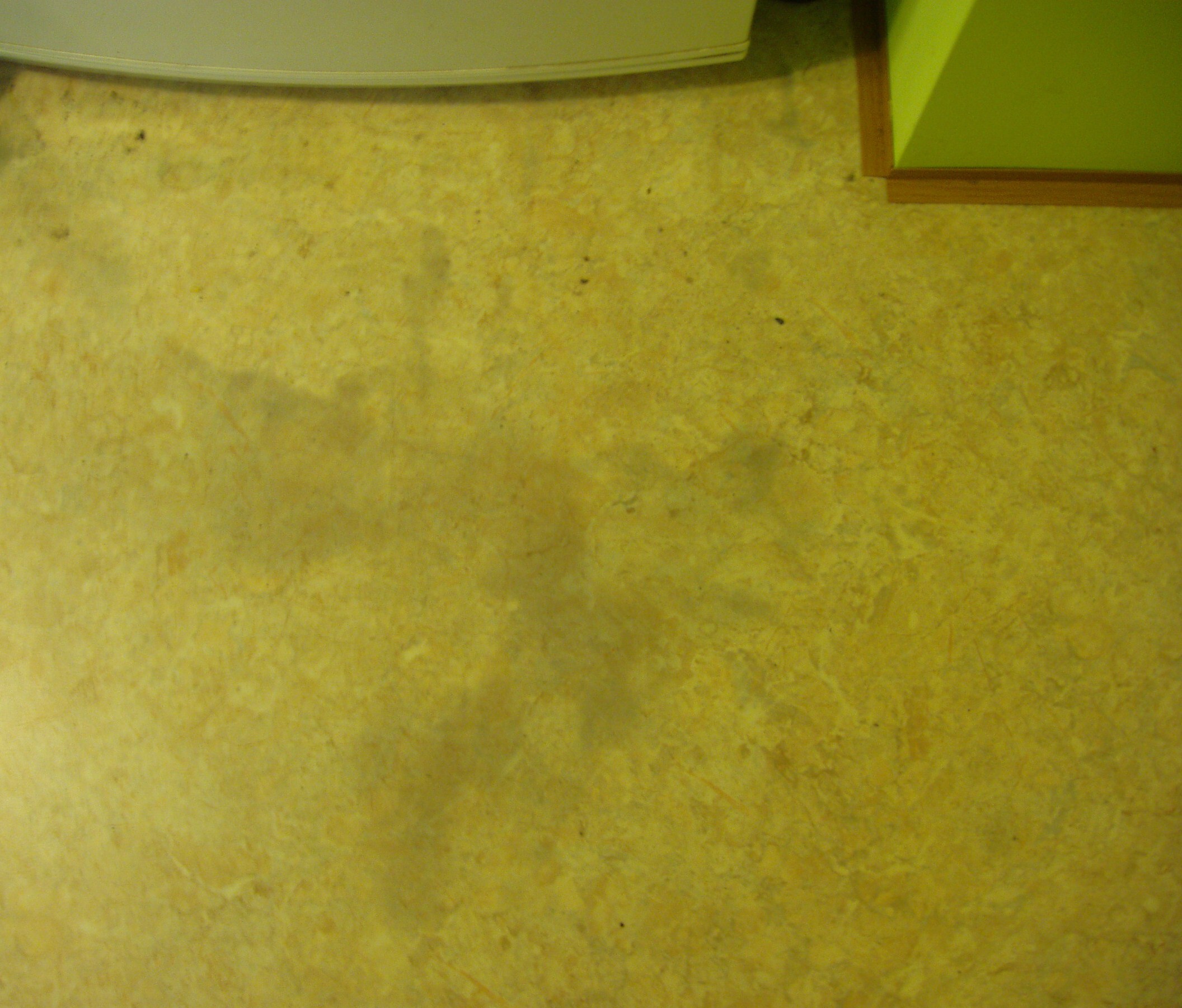 Původně na místě něco stálo (nelze tam nic postavit teď, dům opravujeme, spousta zařízení byla dočasná, teď už to máme jinak). Je to poblíž ledničky, která bohužel tekla. Jenže než jsme si toho všimli (vždy vyteklo jen něco nárazově, takže to nebylo permanentně mokré) a vše důkladně vytřeli, natekla voda všude i pod některé stojící věci. A tam se jejím delším působením stalo tohle.