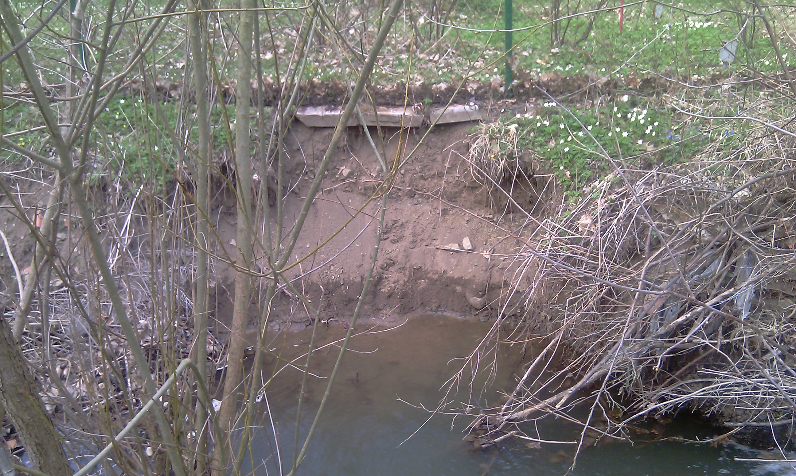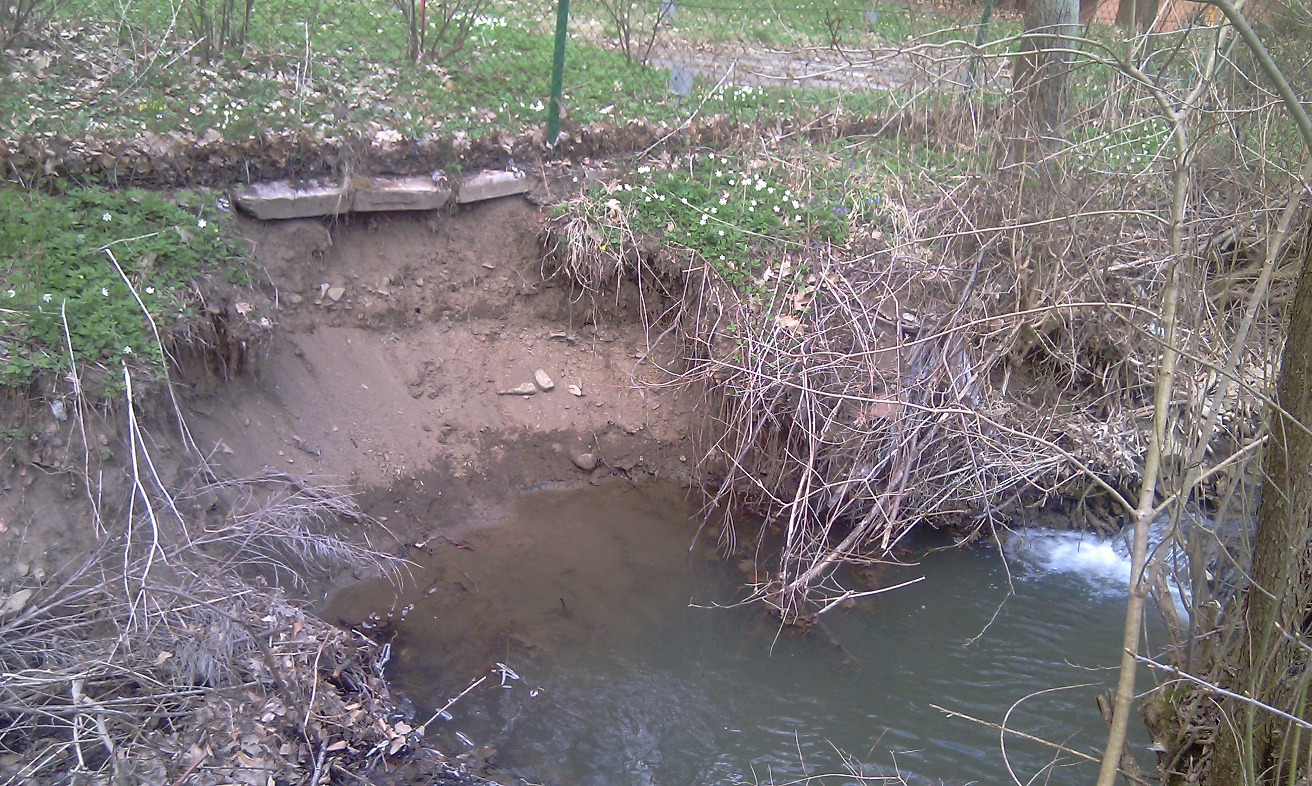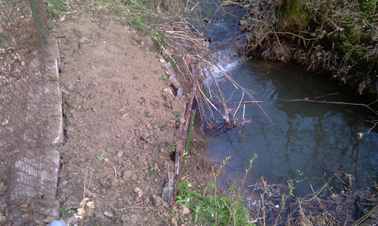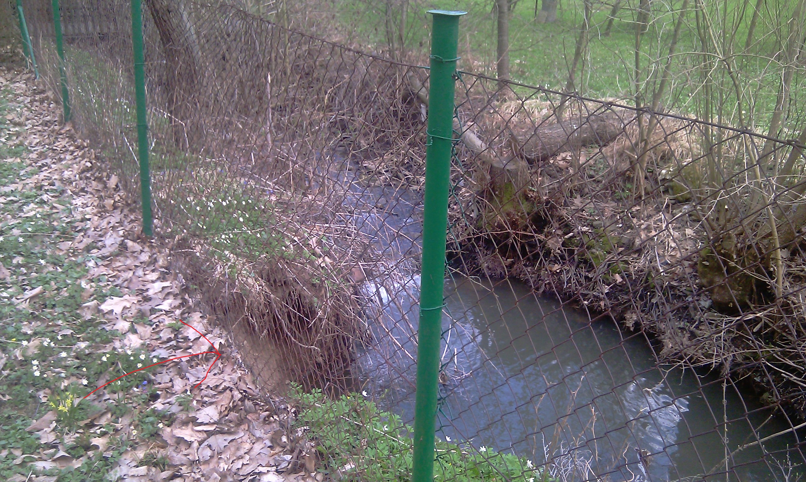 Okolo plotu teče potůček, ale přes letošní zimu to poněkud podemlel a plot tak tak, že stojí.