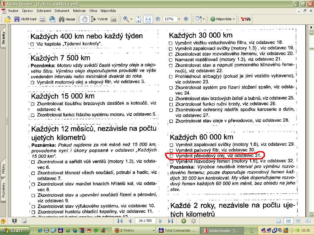 Pro klid duše můžu, protože nevím co tam a jak dlouho bylo předtím, asi tam dám nějakej do automatický převodovky. Ale u těch aut to není tak docela pravda co říkáš, např. u mojí Felicie je přímo v návodu k obsluze doporučeno měnit olej každých 60 000 km, což nedodržuji ani já, ale po rovný stovce sem ho vyměnil a na řazení to teda bylo sakra znát. Přikládám dokument aby si neřekl že si cucám z prstu.
