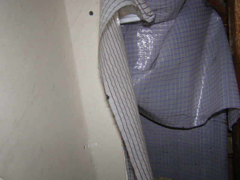 Zatepleno to mám žlutou vatou (13 cm).1 čtverečkovaný igelit (černé čtverečky)mám položený na sádrokartónu pod vatou(strop a stěna co je u křidlic,zbylé boční stěny jen asi 30 cm od vrchu).2 čtverečkovaný igelit (fialové čtverečky)položen nahoře na vatě je pouze na stěně která je u křidlic.