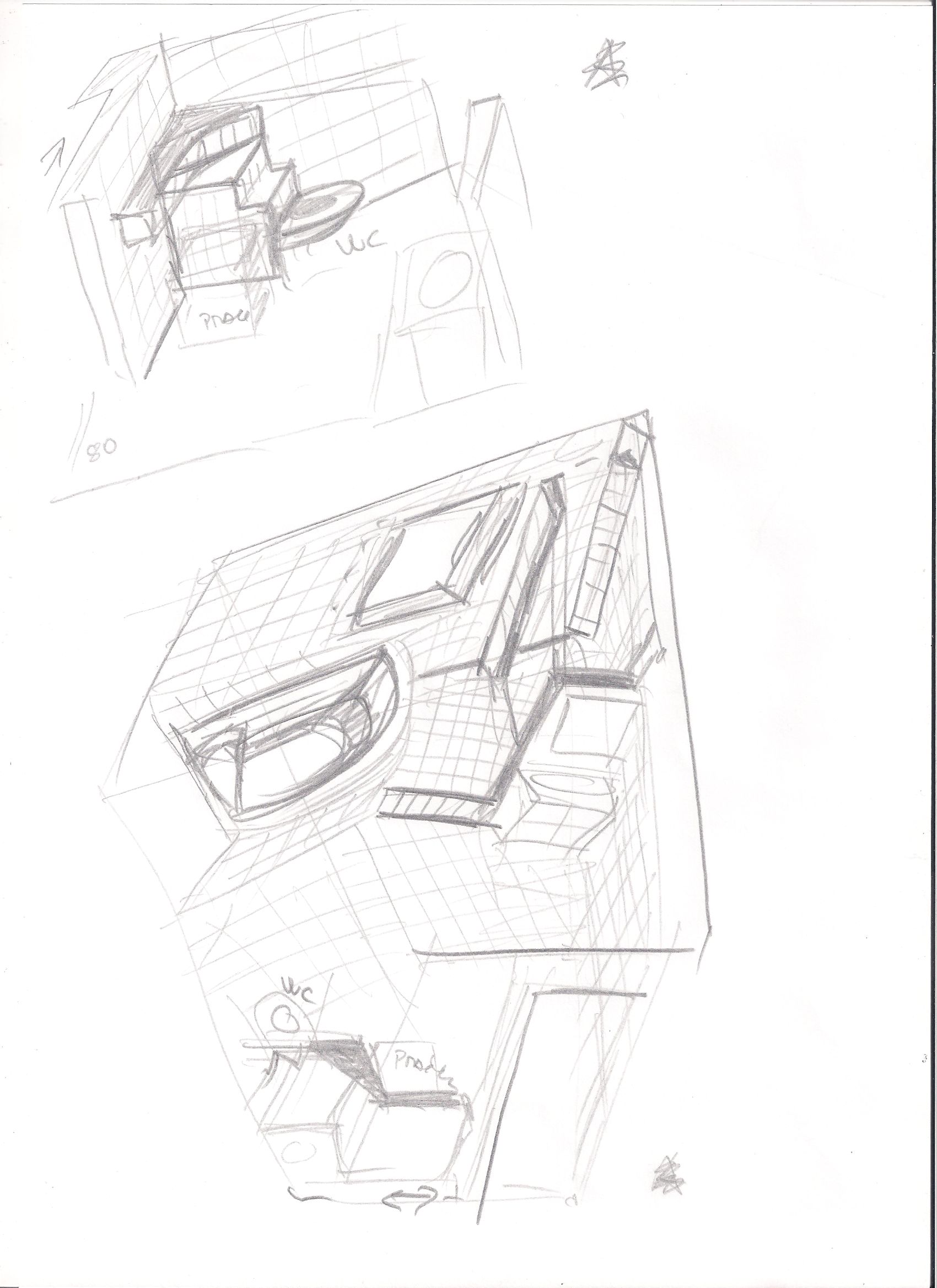 - sprchový kout bychom chtěli dát do toho pravého ostrého rohu (jak jste navrhoval WC), ale nevím, jestli se to dá vůbec nějak vyřešit kvůli tomu blbému úhlu, vanička zapuštěná být asi nemůže, protože podlaha tvoří strop žumpy