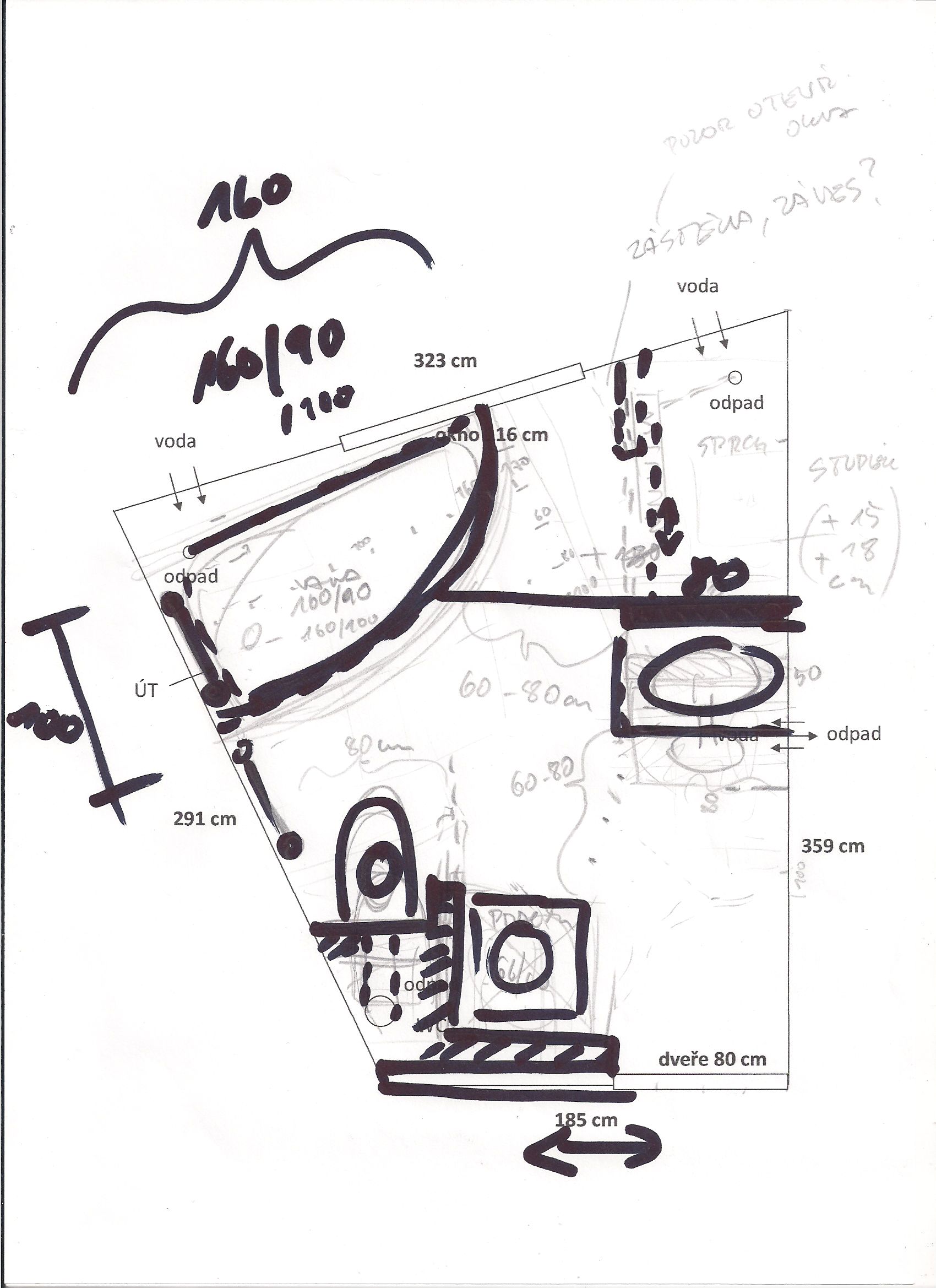 Přikládám náčrtek doplněný o rozvody vody i odpadu, které jsou sice už natažené, nechtěl jsem ale případné poradce omezovat v rozletu