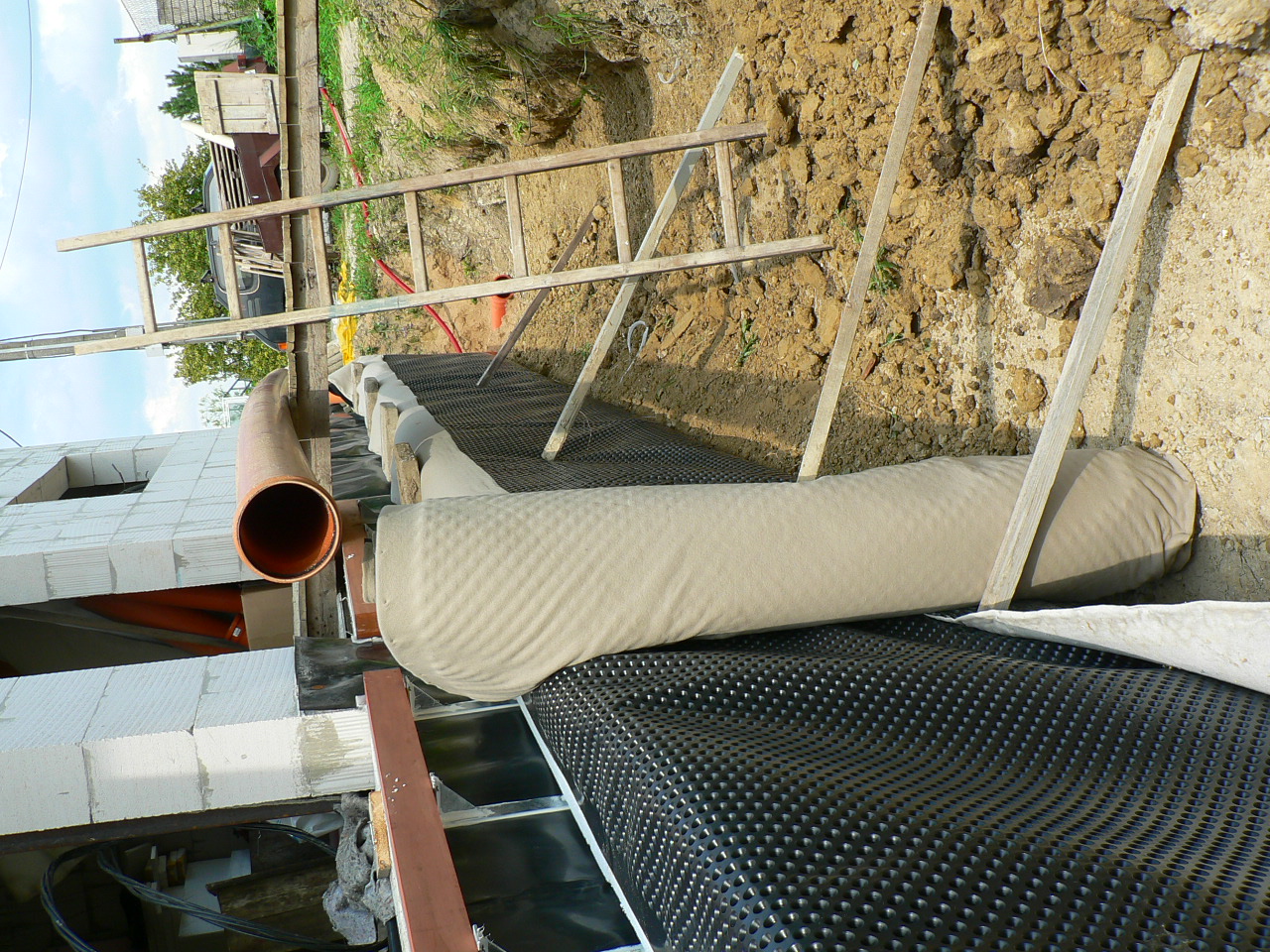 Žlutá trubka je po celém obvodu perforovaná a je tam jen z jediného důvodu, vypline dále. Voda proteče do štěrkového balu přes geotextilii. Tak steče na nejnižší místo, tudíž od horní strany štěrku, přes trubku až dno štěrkového lože na dno s geotextilíí. Dno štěrkového balu je v mírném sklonu směrem ke zběrnému místu (obbetonovaný 200 litrový sud, v něm nezávisle 2 kalová čerpadla, každé a jinou fázi- on někdy vypadne jedna fáze a ta druhá je vždycky živá, dosavadní praktická zkušenost). Voda může protíkat celým štěrkovým balem jak samožřejmně trubkou, ale i spodní částí štěrku, vzduchovýma mezerama. Pokud je jí víc, protíká, pokud by jí bylo extremně moc, tak potom proteče právě tou perforovanou trubkou do zběrného místa zvižně, protože trubka jí zajistí dostatečný průtok. Todle vše, je POD úrovní základové spáry (základovou sklepní deskou), pod úrovní izolace (mám svařenou kompletní vanu kolem zdiva sklepa o hloubce 3,2 m - PENEFOL 750 1,5 mm). Jestliže přestane pršet, co odteče, se vyčerpá. Pak se zbytek má šanci zase vsáknout do hlubších vrstev podloží, což se taky tak děje. Výsledek je, že i přesto že mám sklep kompletně vyzděný z Ytongu (!), tak je všude naprosto sucho, vyzkoušeno 3 letou praxí a 2 extremně deštivé jara, kdy na zahradě stála samovolně voda a neměla už možnost se dál někam vsakovat.