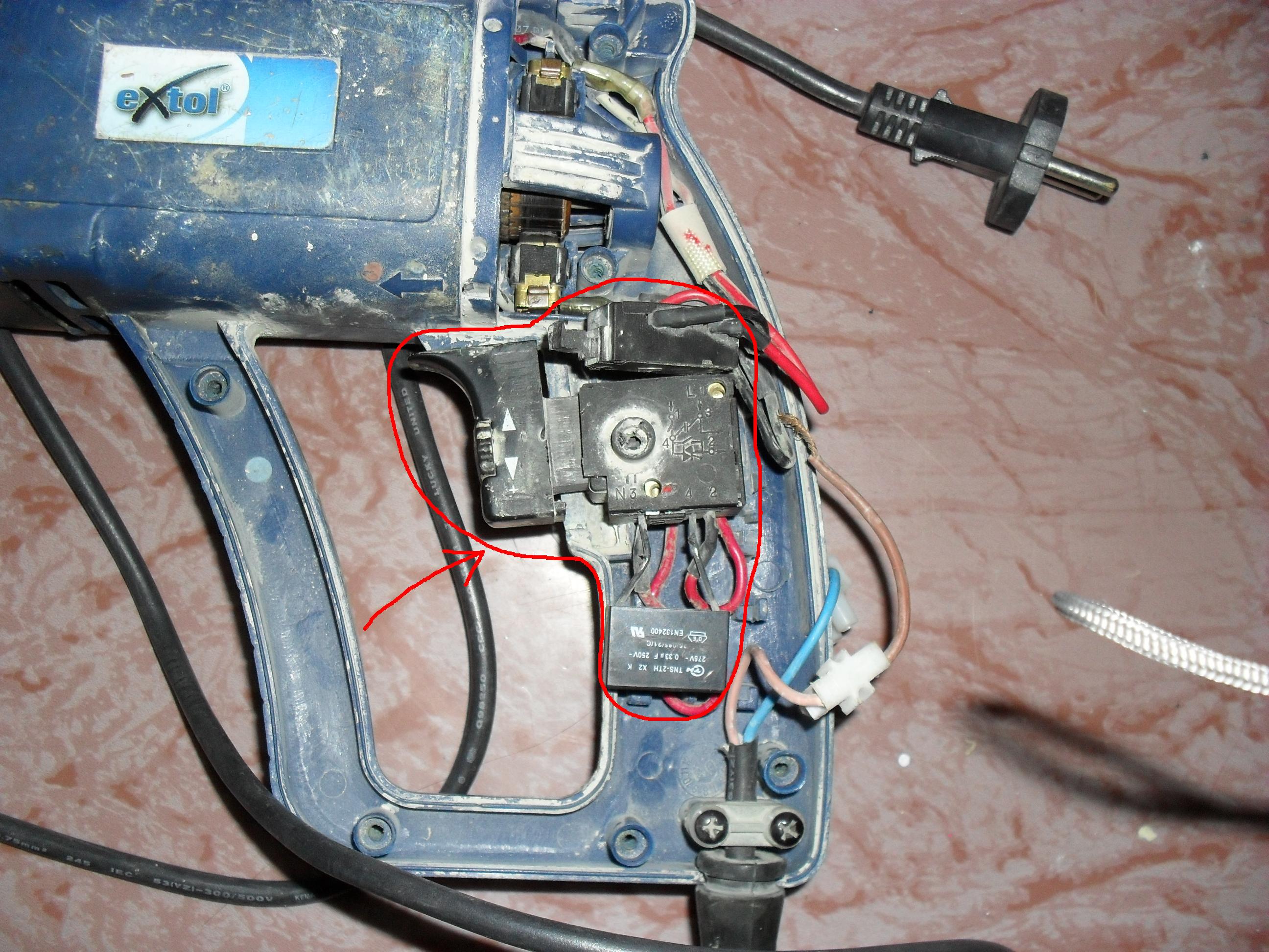 Dobrý den. Chtěl jsem se zeptat, jestli je možné zapojit do vrtačky, která má spoušť (spínač) s kolečkem pro regulaci otáček pouze nějaký nearetovaný spínač (230V), pokud ano, popsal by prosim pro jistotu někdo schéma zapojení (aby tam byl i ten původní rozběhový kondenzátor). Jinak se jedná o vrtačku Extol SDS Plus 800W, byl problém s rozeběhem vrtačky, rozběhla se jen někdy, jinak v ní vrnělo, odzkoušel jsem ten kondenzátor, ten by měl bejt v pořádku (nabíjí a vybíjí se), pak jsem rozebral ten spínač (spoušt) a ten byl vevnitř celý rozpadlý(jak plast tak kovové pacičky kontakty)Přikládám fotku..