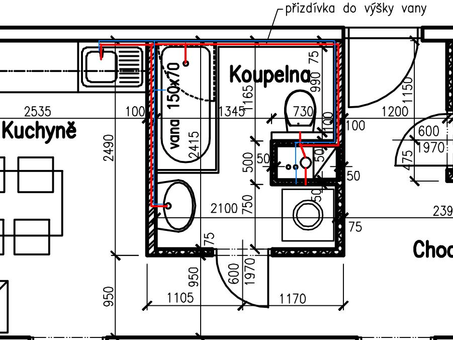 Představuju si to tak, že po vybourání papundeklového jádra se postaví nové zdi a v koupelně mám v plánu nechat zvýšit podlahu a snížit strop. Ve zvýšené podlaze povedou odpady a voda do přesunuté kuchyně, ve sníženém stropu bude vzduchotechnika (digestoř, odvětrání koupelny) a elektroinstalace.