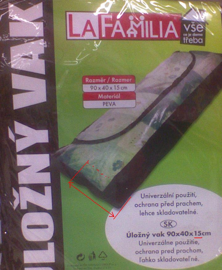 Pro uskladnění dek, spacáků, mimosezónních oděvů a jiných textilií, které nepoužíváme denně máme úložné vaky co se nám akorát vejdou na skříně. Jsou takové jako ty v příloze, akorát výšku mají asi třikrát vyšší (ostatní rozměry možná nejsou přesně na centimetr stejné ale tak nějak sedí). Vaky mají dost mizernou životnost a občas je musíme vyměnit. V současné době zase potřebujeme koupit nové, ale jako na potvoru je nikde nemohu sehnat (někdy jsem je kupoval pod značkou Coronet a snad i jinou).