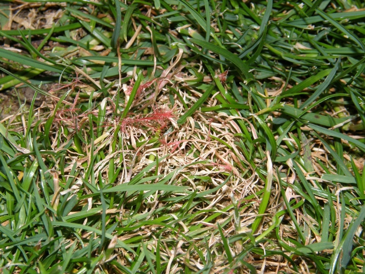 Aha. Tak na téhle fotografii jsou zcela zřetelně vidět chomáčky a nitky - což značí napadení tzv. "nitkovitostí", neboli Kornatkou travní (Laetisaria fuciformis)